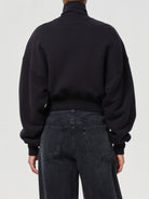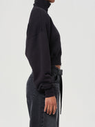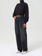 The Darby Zip Up is a high-collared sweatshirt with a cropped, boxy fit and exaggerated ribbed hem. Crafted from breathable, soft cotton fleece with a natural drape, this washed black version offers an effortless, lived-in feel. Style with tonal denim or layer over a slim tank for a relaxed yet refined look.