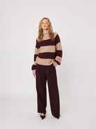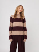 Bold and cozy, this oversized striped sweater brings effortless cool to your everyday style. Featuring wide horizontal stripes in rich burgundy and warm taupe, it’s crafted from a soft knit blend with a relaxed silhouette and dropped shoulders for maximum comfort.