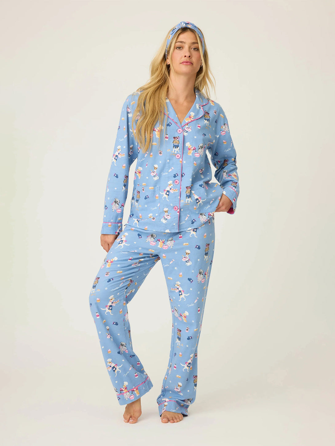 Sleep, lounge, repeat in this dream of a three-piece flannel set. Made from soft cotton in a classic twill weave, it includes a button-up shirt, relaxed-fit pants, and a matching headband to top things off. The soft blue fabric is sprinkled with pups baking cupcakes, plus playful paw prints and kitchen doodles—bringing a lighthearted touch to your bedtime lineup.