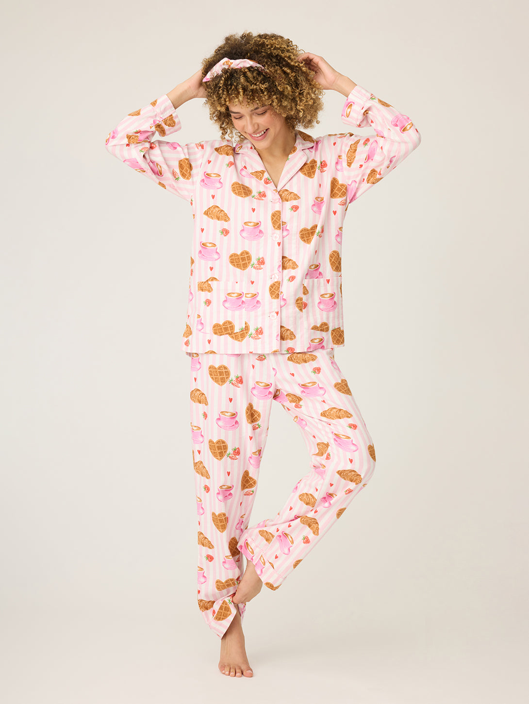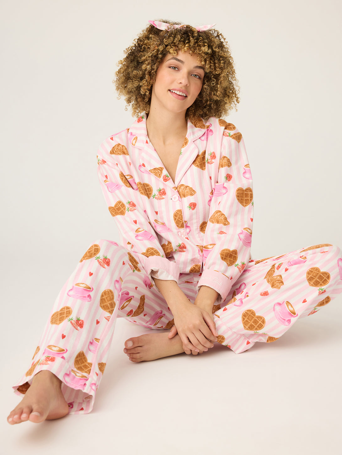 - Women’s flannel PJ set in pink-and-white stripe with heart-shaped waffles, croissants, latte cups, and strawberries