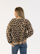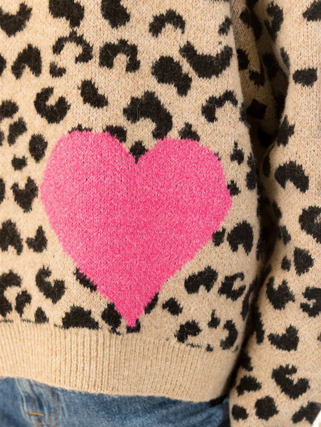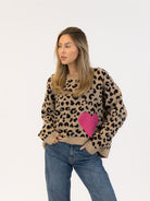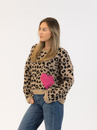 Make a bold statement with this leopard print sweater, featuring a vibrant pink heart detail for a fun pop of color. The relaxed fit and cozy knit fabric make it perfect for adding playful charm to your casual wardrobe.