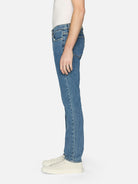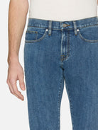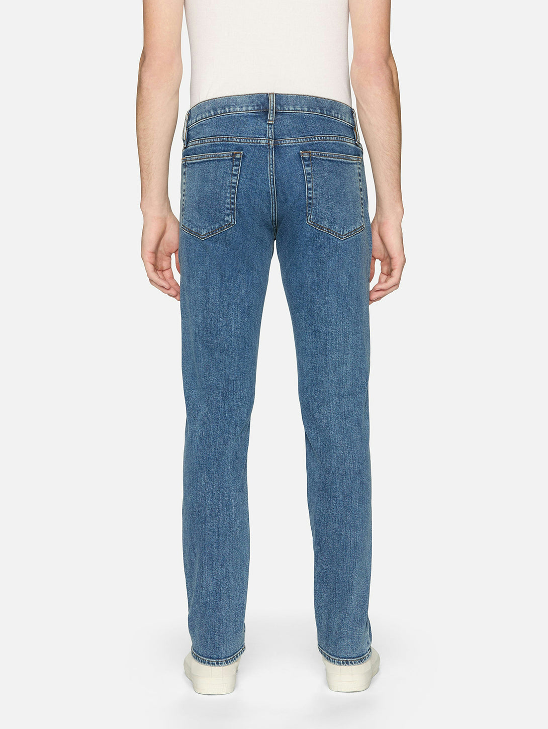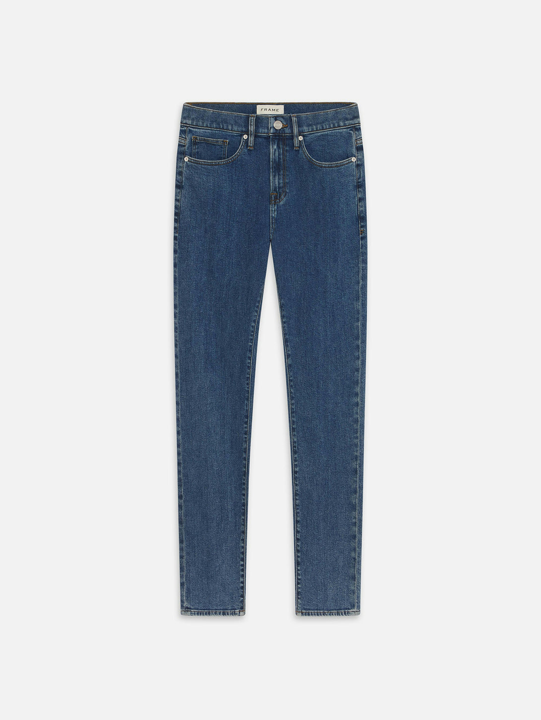 A FRAME signature jean, this style is designed with a classic 5-pocket construction, comfortable mid rise, flattering straight leg, and tapered slim fit at the leg opening. Crafted from smooth Structured Stretch denim in a faded blue wash.