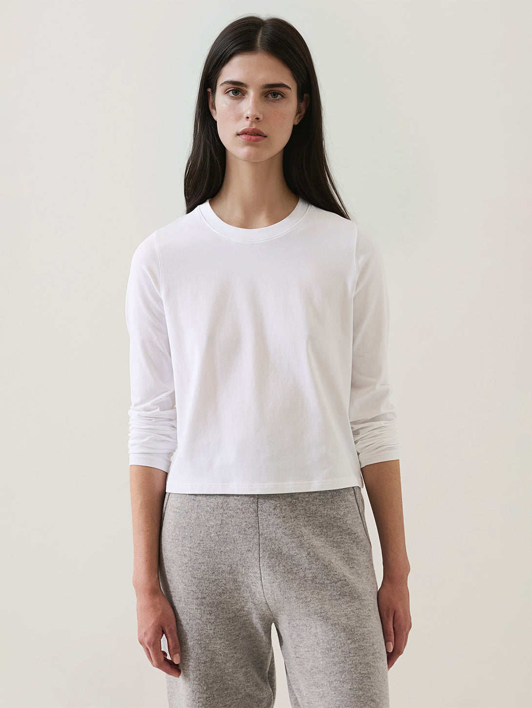 Our long sleeve baby t-shirt is cut from our iconic Peruvian pima cotton stretch jersey and cut in a slightly cropped fit. This piece is designed to be a season less wardrobe essential and is ideal to layer with your favourite denim or trousers.