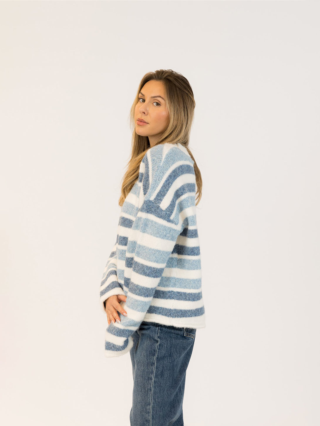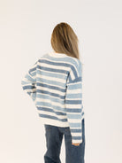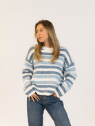 This crewneck pullover features a classic blue and white stripe design, offering a timeless and stylish look. Its soft fabric ensures comfort, making it perfect for both casual and semi-formal occasions.