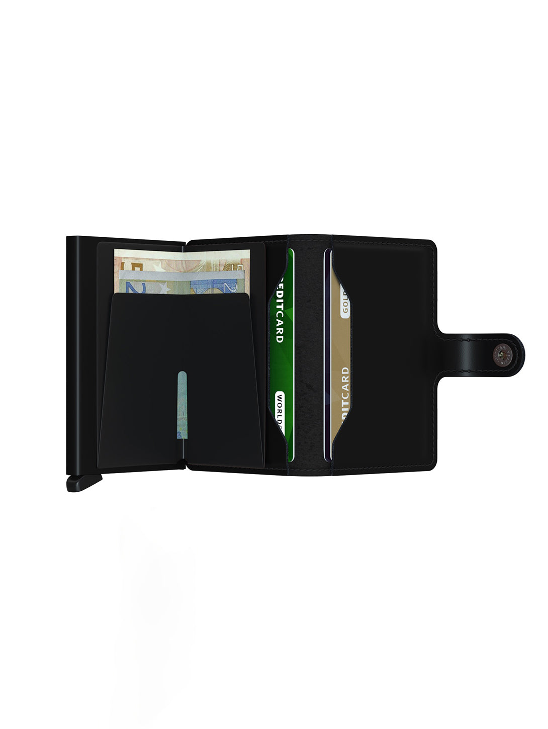 Small in size and surprisingly large in storage capacity, the Miniwallet combines the best of both worlds. The exterior holds banknotes, receipt and cards, while the aluminium Cardprotector allows you to slide out cards with one simple motion and protects them from bending, breaking and unwanted wireless communication.