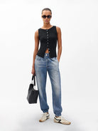 - Non-stretch denim- Non-stretch denim that breaks in over time.