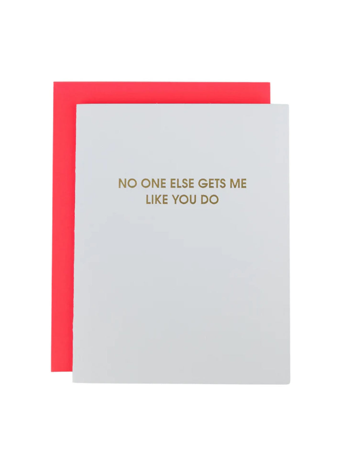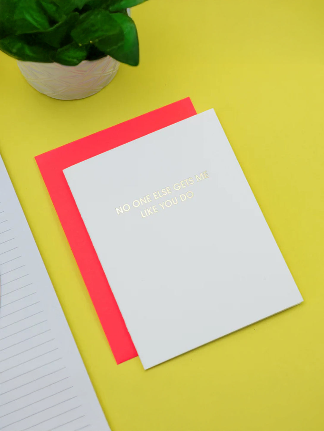 Our "No One Else Gets Me Like You Do" card is letterpress printed on a vintage printing press in sunny California.