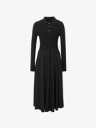 A fitted black dress with clean lines and modest length, offering a balance of simplicity and elegance. Perfect for desk-to-dinner versatility.