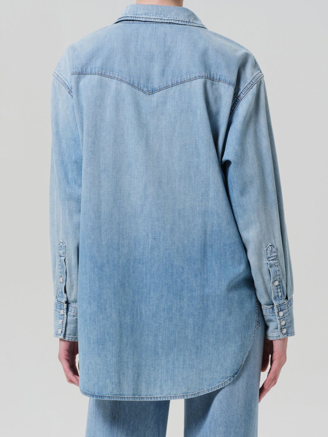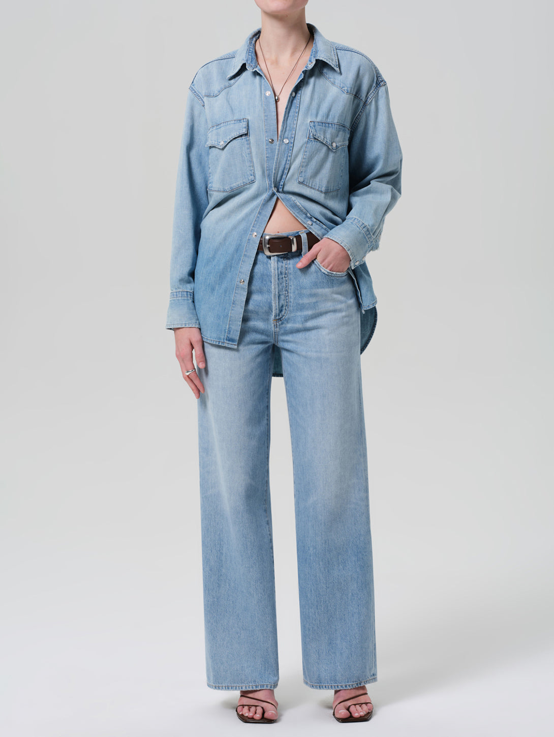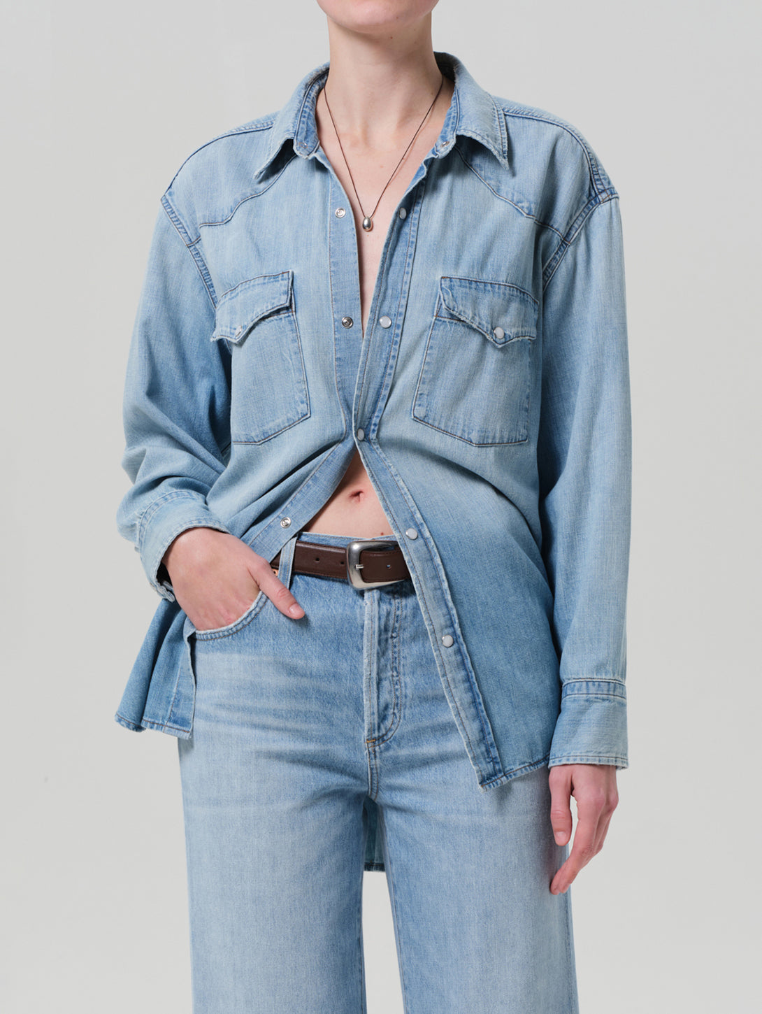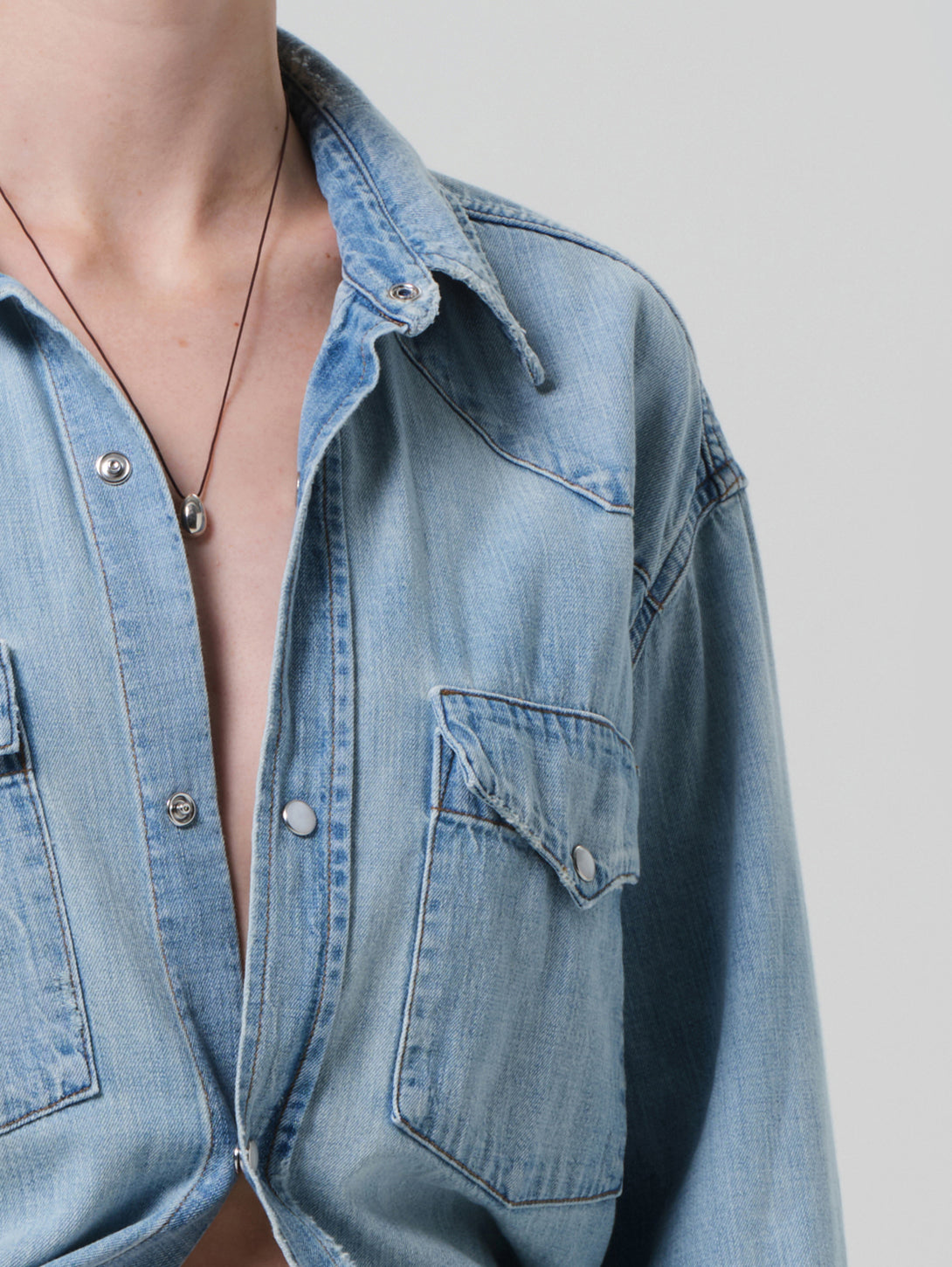 The Rancher Kayla Shirt reimagines our signature Kayla silhouette with a rugged, western-inspired twist. Crafted from premium Japanese denim, it features authentic pearl snap buttons and utility details that add a distinctive charm. Made from 100% cotton, this shirt blends timeless denim appeal with subtle western flair. Style it tucked into high-rise jeans for a coordinated, vintage look, or layer it over a tee for an effortlessly cool, laid-back vibe. A versatile piece that can be dressed up or down with ease.