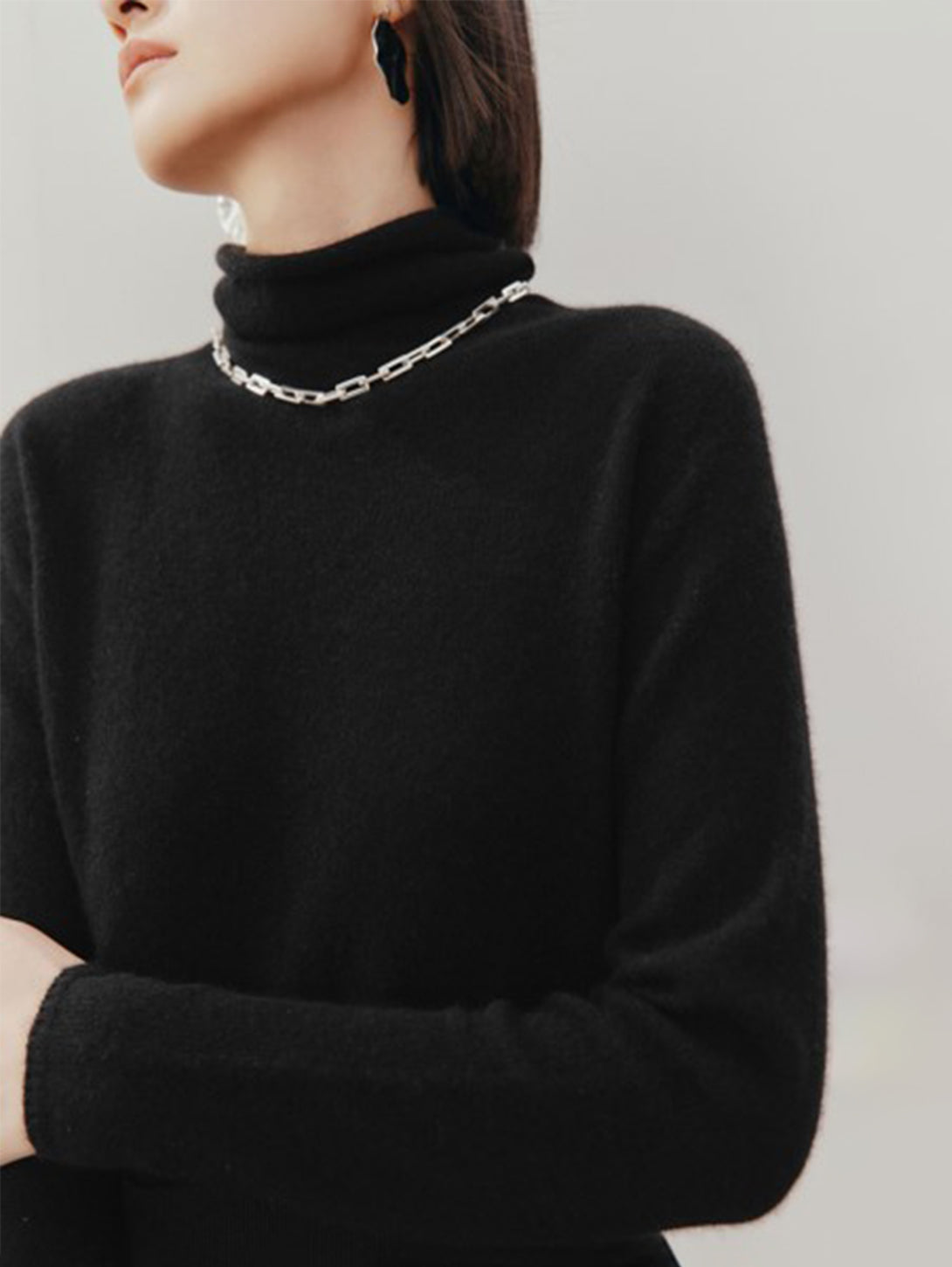 A sleek, everyday black sweater with a structured fit. An essential layering piece that transitions easily from casual to polished.