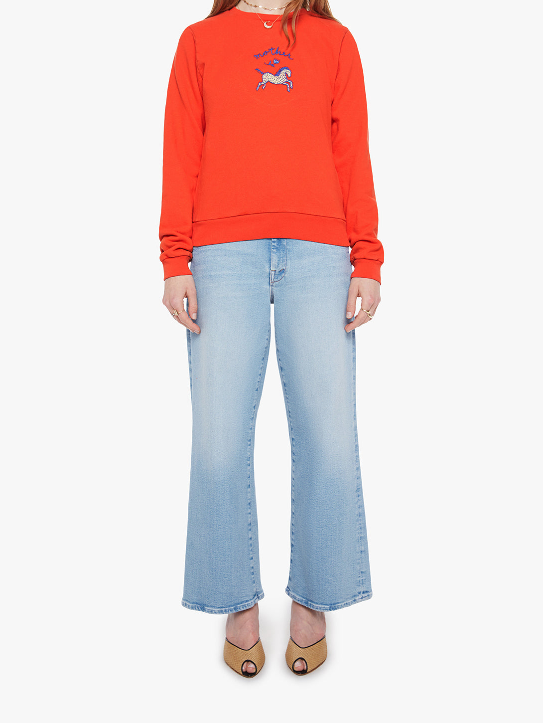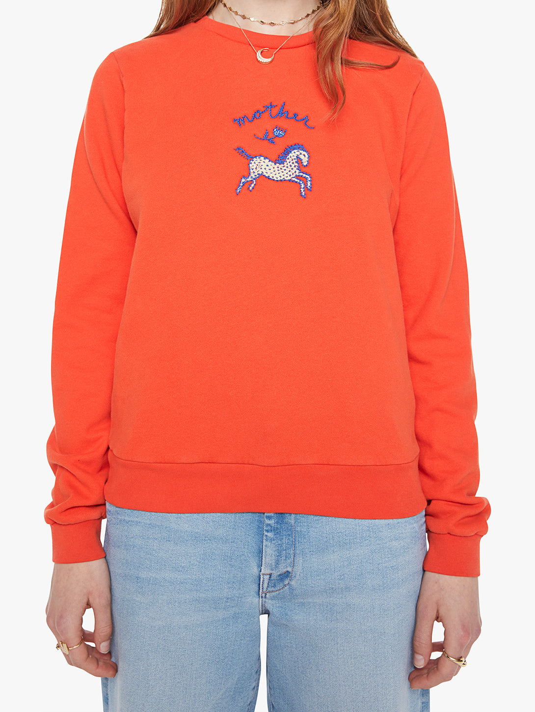 A crewneck sweatshirt with ribbed hems and a loose fit. Made from 100% cotton in red orange, The Camper in Lil Pony features a pony graphic and text on the front.