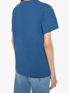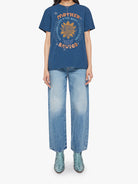 A crewneck tee with an oversized fit and a clean hem. Made from 100% cotton, the blue tee features a graphic with rhinestones details and text in colour font.