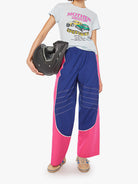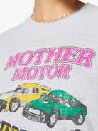 Start your engines. A soft crew neck with a slim fit for a vintage look and feel. Made from a SUPERIOR blend of cotton and linen in light blue, The Sinful in MOTHER Motors features a colorful raceway graphic on the front and bright pink logos on the back.