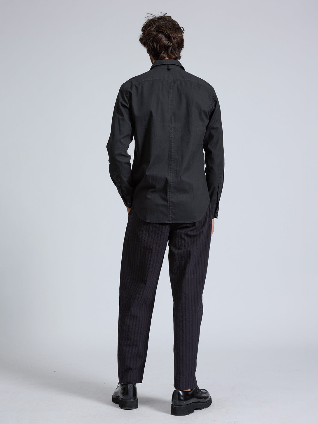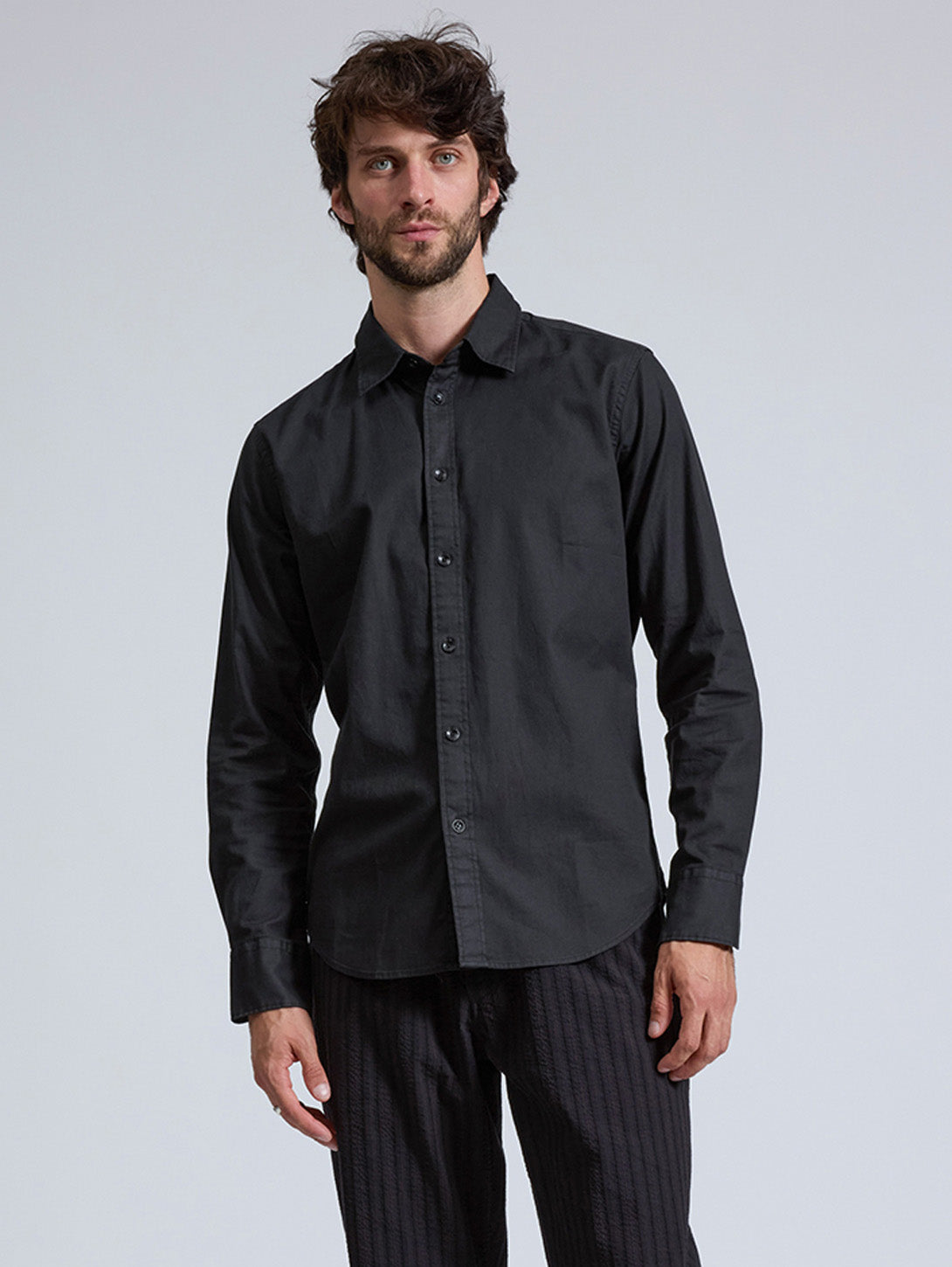 We updated our signature shirt in cotton dobby woven with a comfortable touch of stretch and the subtle texture of a small geometric pattern. Classic fit. Buttons at center front and cuffs, faux bone button at sleeve placket
