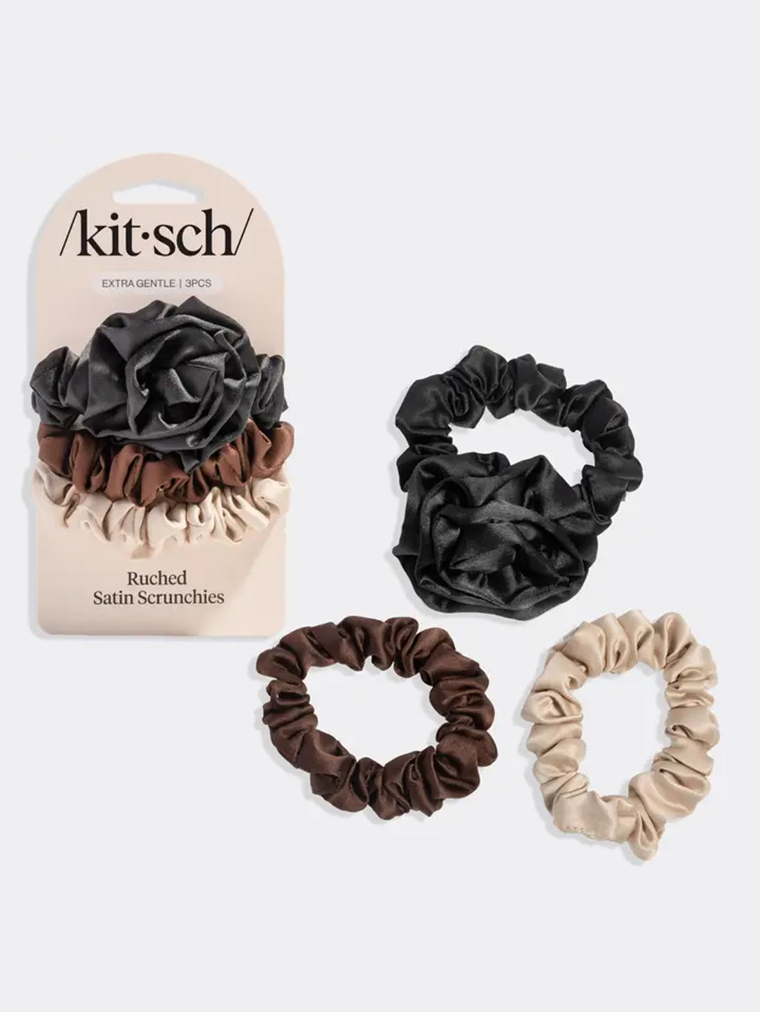 Rosette Ruched Satin Scrunchies 3pc Set - Black
