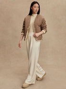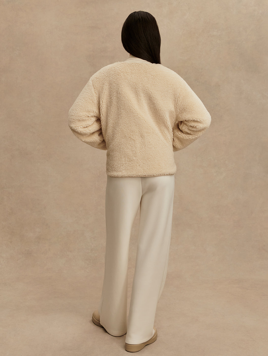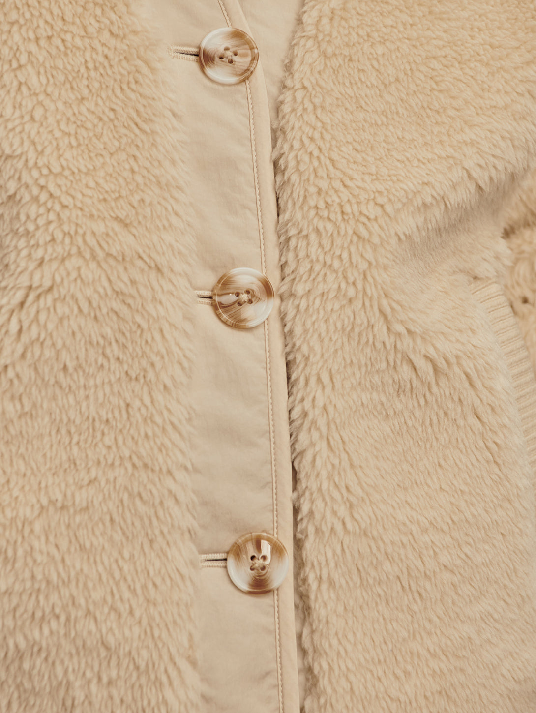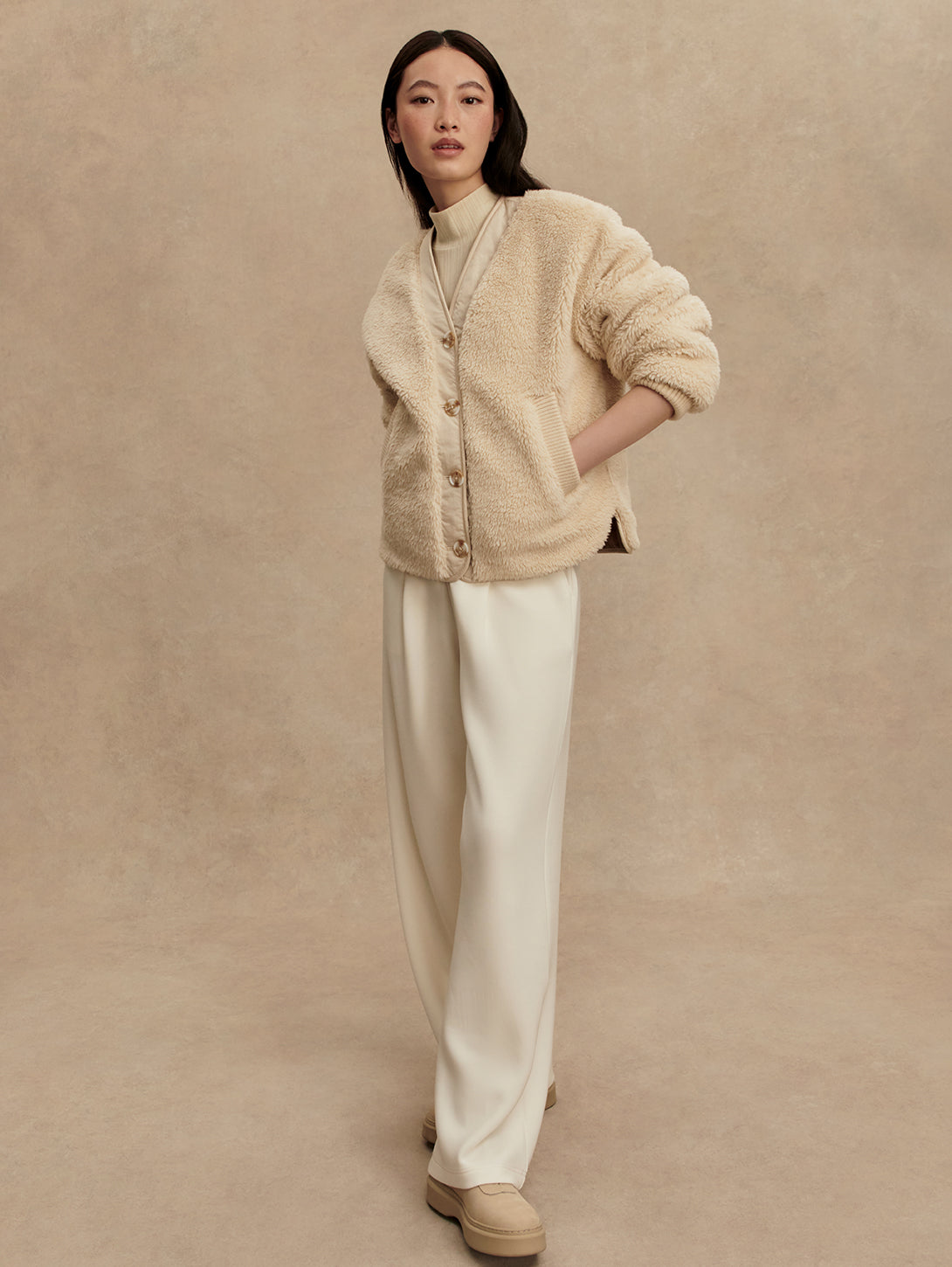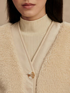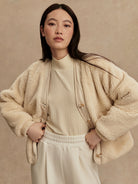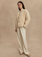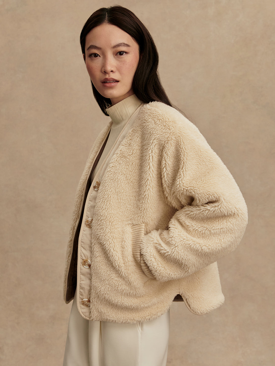 This reversible layering staple is made from true sherpa with knitted pockets on one side, and a Crinkle Shell fabric with vertical quilting and patch pockets on the reverse side. The contemporary cardigan-like shape is an easy throw-on design, accentuated with a button fastening, knitted rib cuffs, and contrast binding on the reverse side.