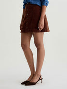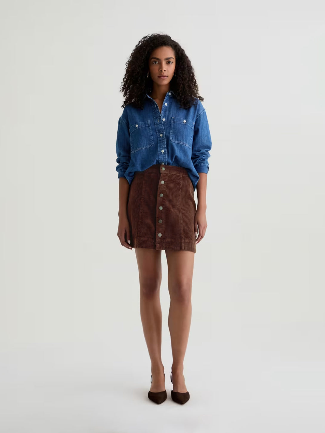 The Evie Corduroy Skirt is an A-line mini crafted from soft corduroy. The fabric offers a cozy texture and structure, while metal snaps down the center front add a vintage-inspired touch to this flattering silhouette.