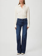 This 90s-inspired sleek wide leg is designed with a high-rise and a flattering bow leg silhouette with a 32" inseam that pairs perfectly with flats and also works well with a heel for petite women. This style is cut from PAIGE VINTAGE denim in a clean and classic dark blue wash. PAIGE VINTAGE takes all the work out of breaking in your favorite pair of vintage jeans. We've combined the comfort of stretch with everything you love about authentic vintage denim to create super soft jeans that feel perfectly lived-in from the very first wear.