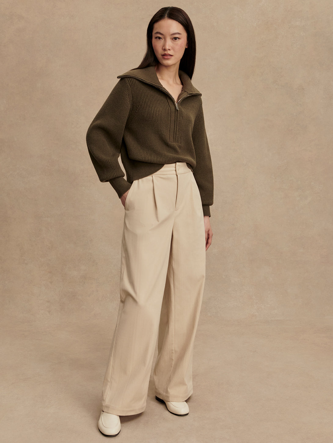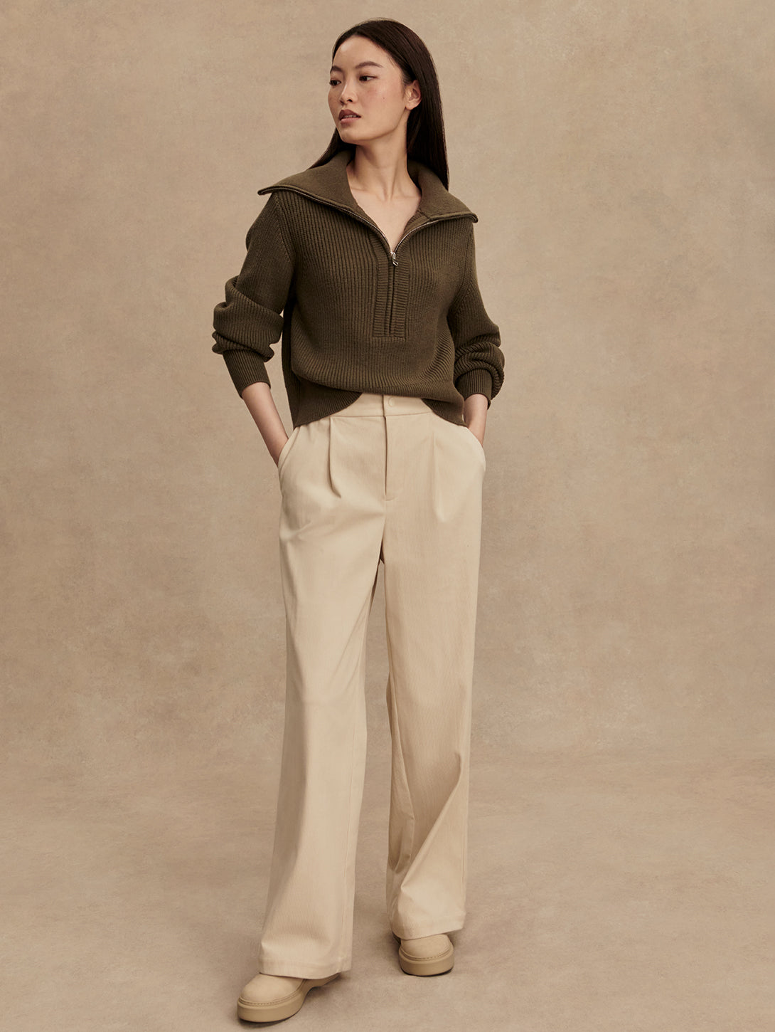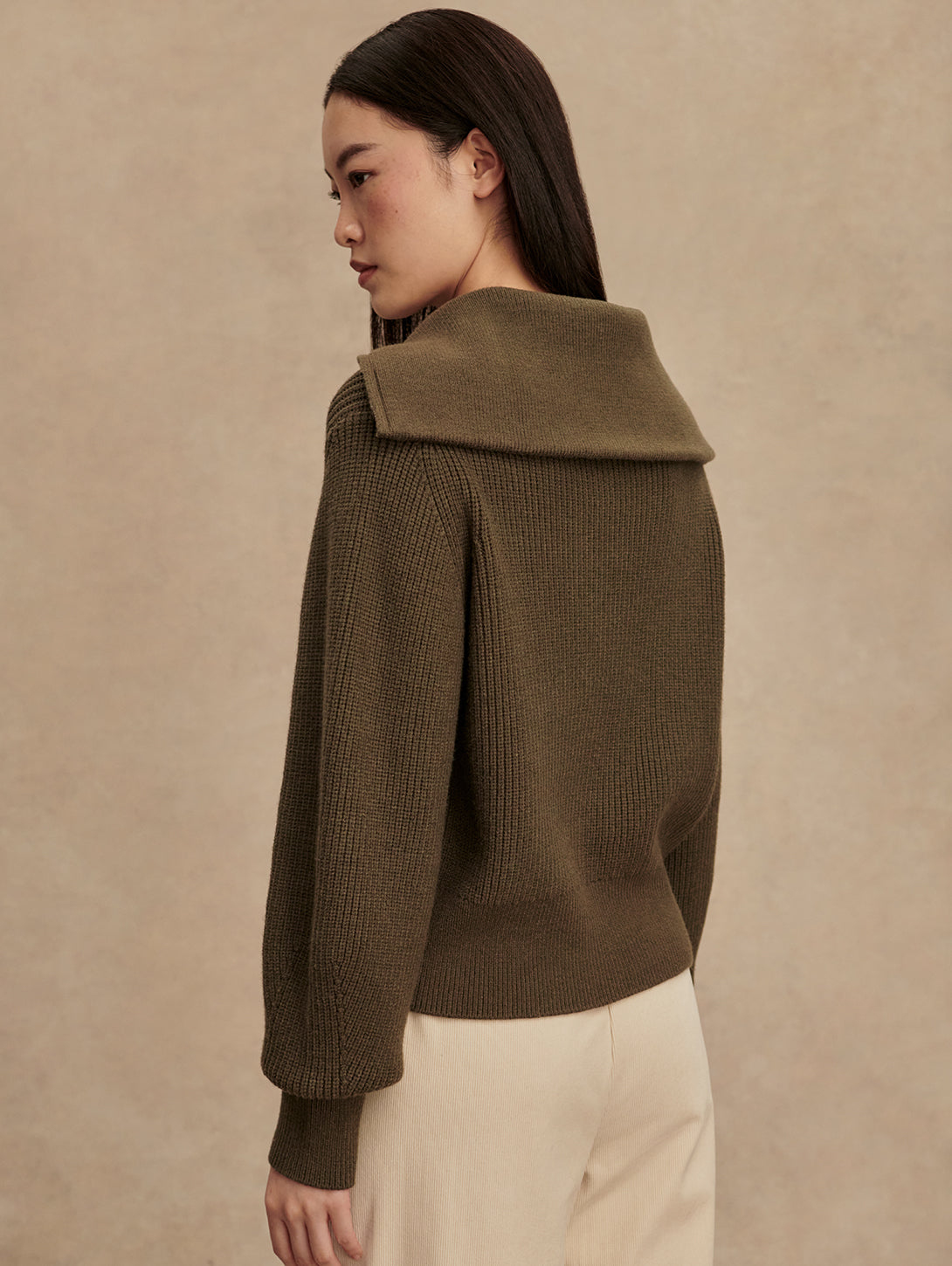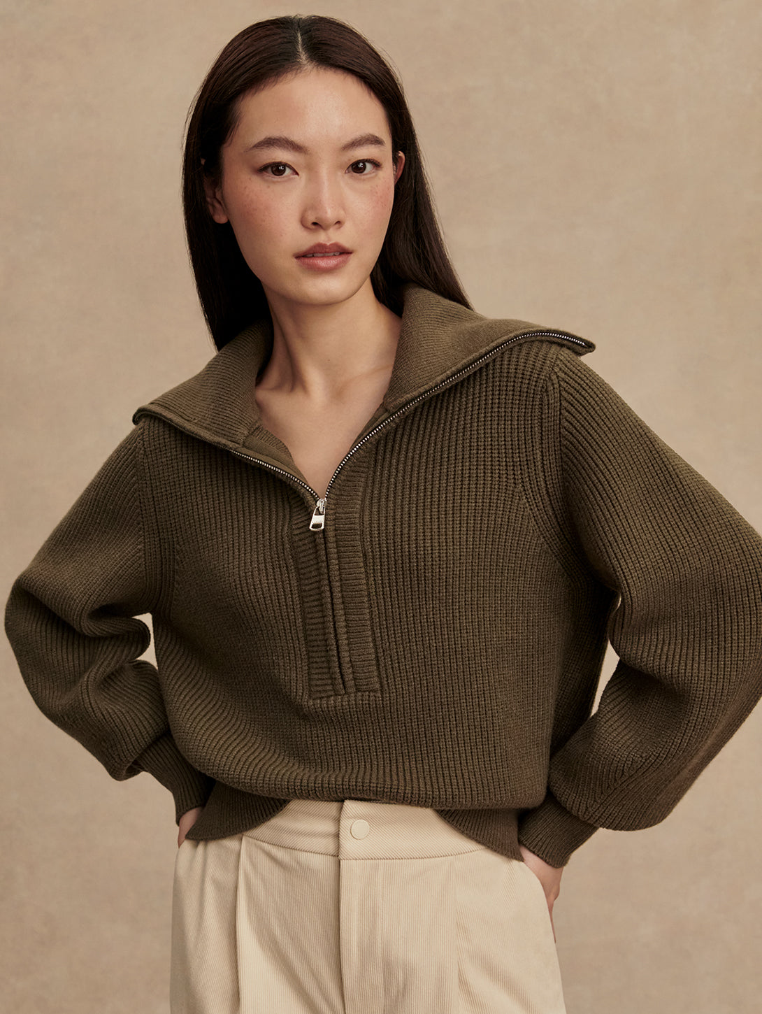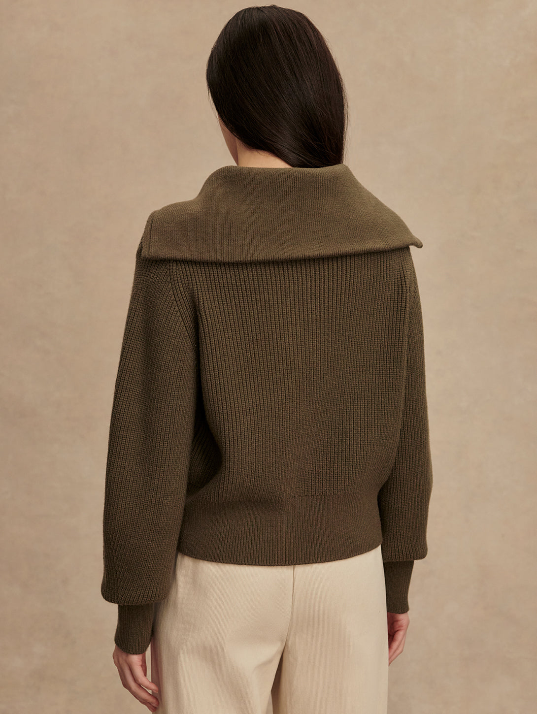 The Maura is a half-zip version of the Enrico jacket, crafted from the same mid-gauge Soft Viscose yarn. Soft to the touch and versatile for all-season layering, the Maura features fashioned armhole detailing and a statement turn-back collar.