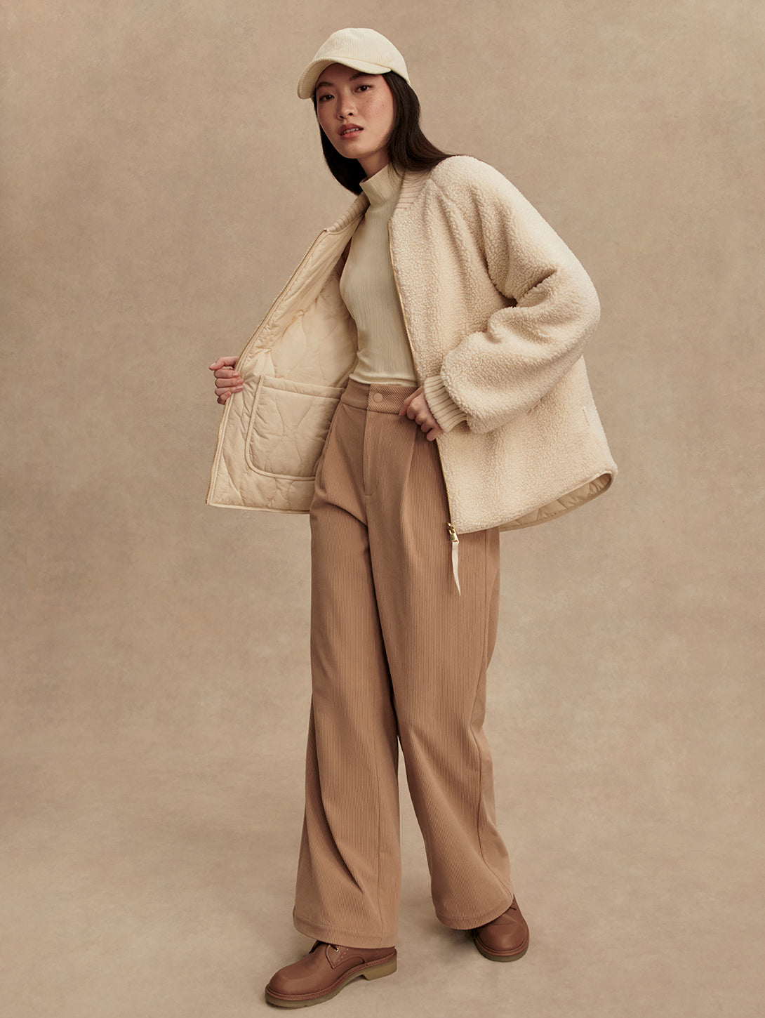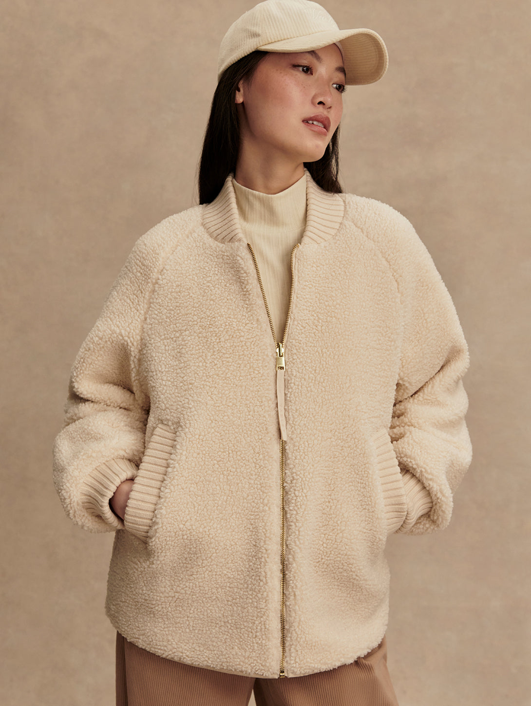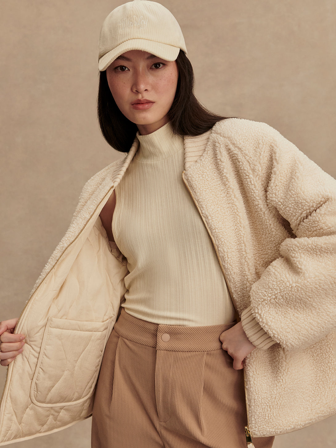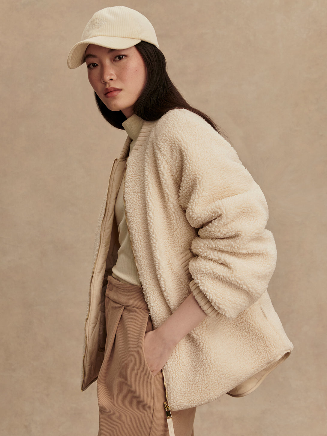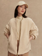 The Serina is made in a tight and curly Bouclé Sherpa with welt pockets on one side, and a Crinkle Shell fabric in an onion quilt design and patch pockets on the other. Both sides of this reversible, throw-on-and-go jacket show the chunky knitted cuffs and collar. Cut to a boxy bomber-shape with a curved hem, the Serina is perfect for cold-weather layering.