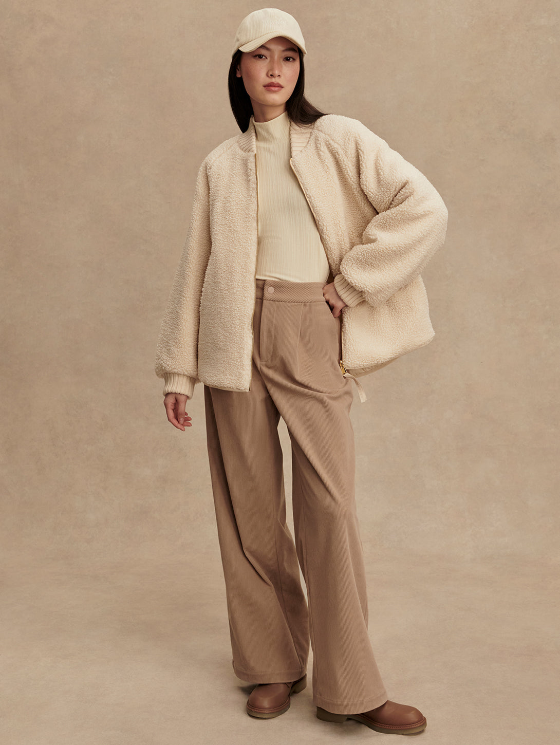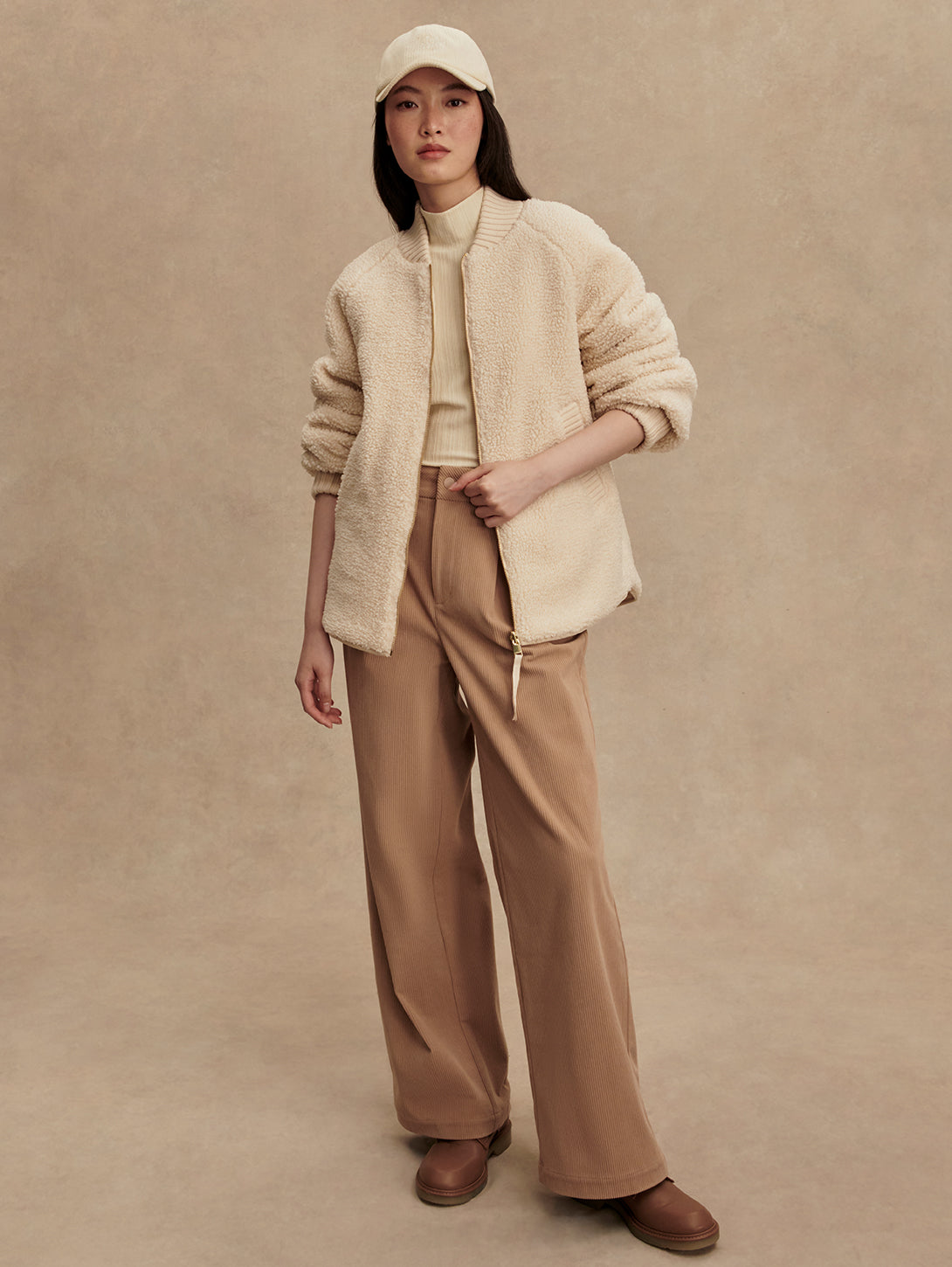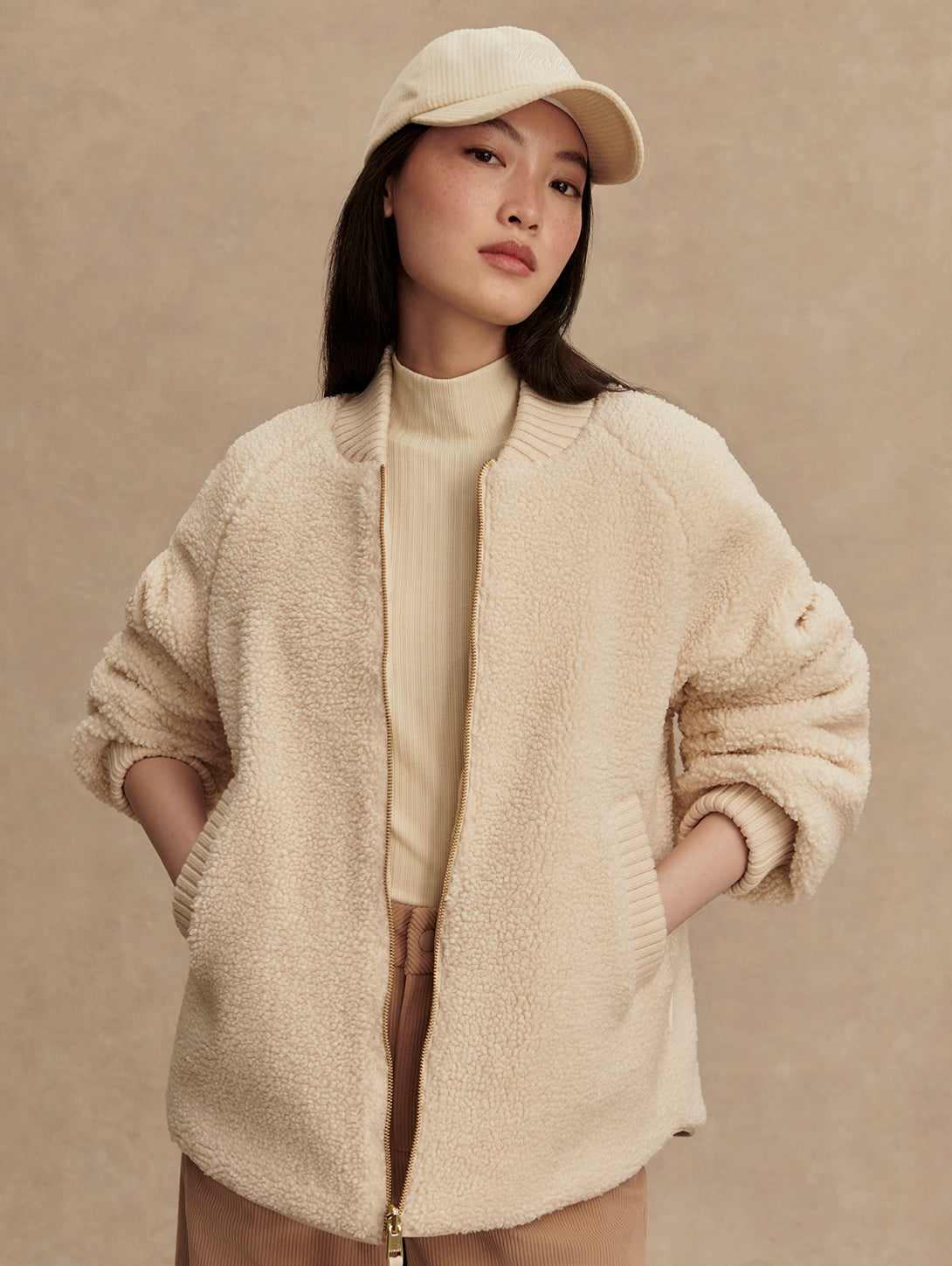 The Serina is made in a tight and curly Bouclé Sherpa with welt pockets on one side, and a Crinkle Shell fabric in an onion quilt design and patch pockets on the other. Both sides of this reversible, throw-on-and-go jacket show the chunky knitted cuffs and collar. Cut to a boxy bomber-shape with a curved hem, the Serina is perfect for cold-weather layering.