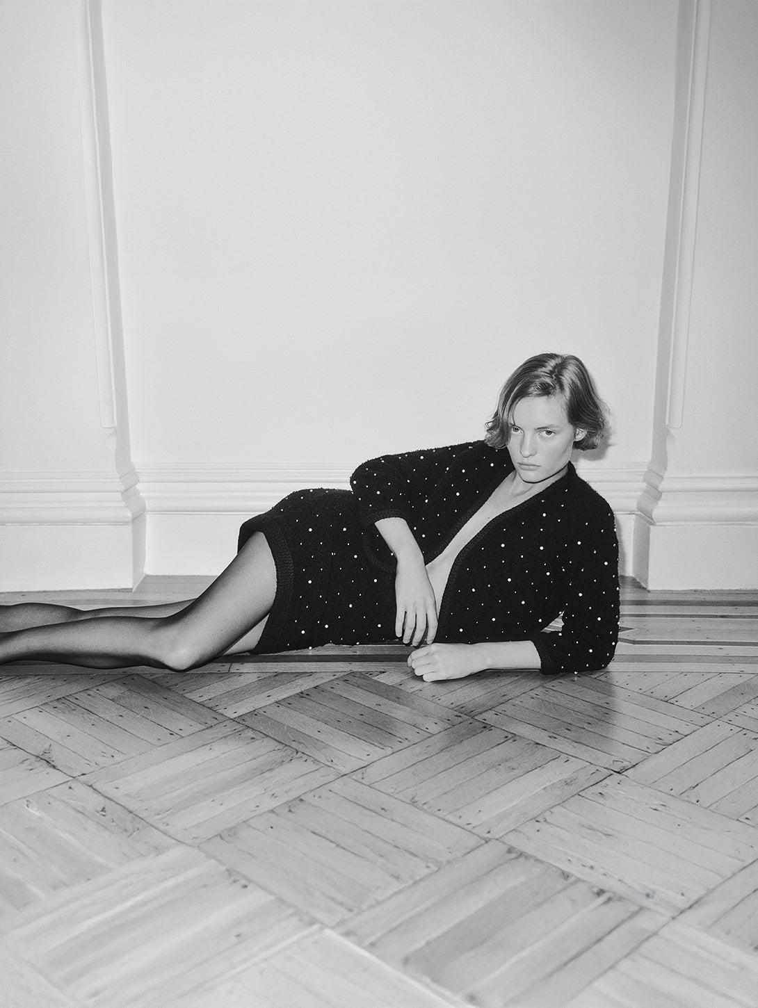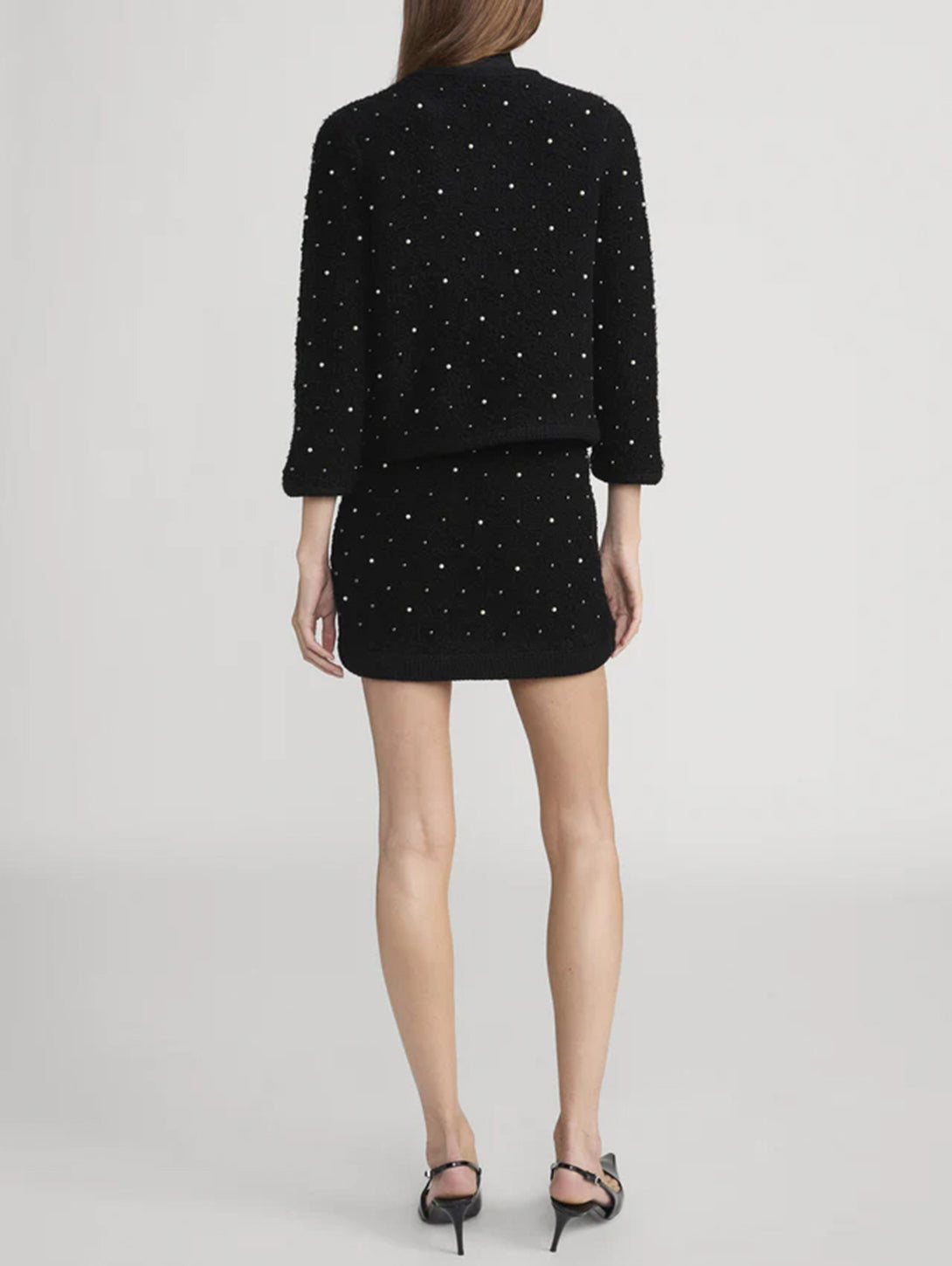 This classic yet modern knit is embellished with pearls and rhinestones throughout. The silhouette features delicate three-quarter length sleeves and no closure. Pair with The Embellished Skirt for the full look.