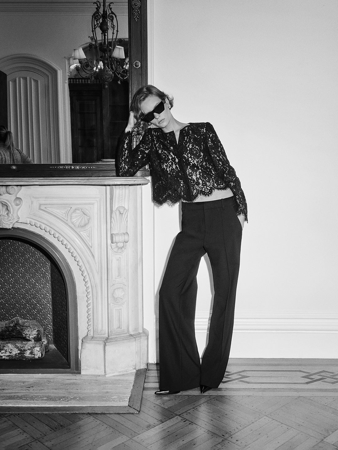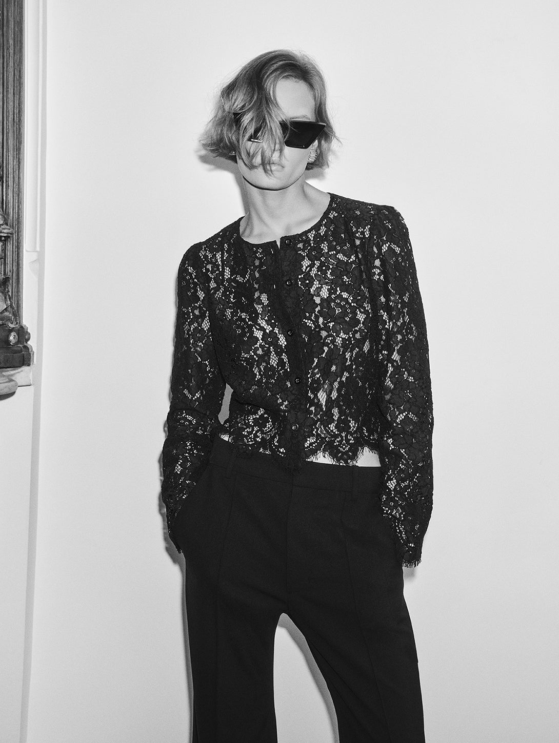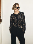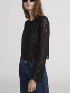 This effortlessly polished blouse is crafted in heavy lace for a modern, structured silhouette, and finished with femme scalloped edges. Waistband-grazing, with full-length sleeves and subtle button closures.