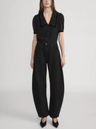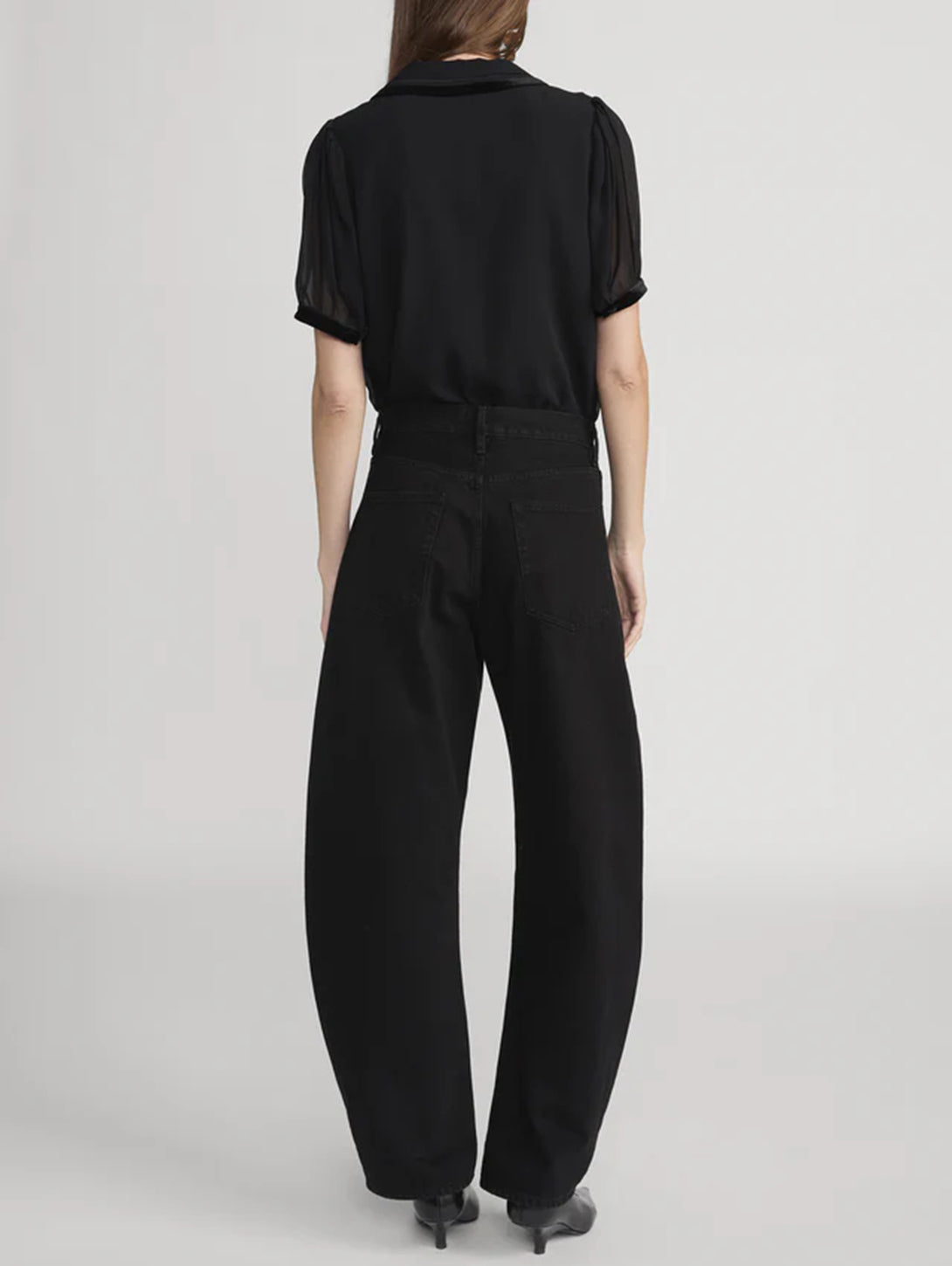Our pure silk sailor blouse, elevated with velvet trim at the collar. A feminine silhouette with short, slightly puffed sleeves and an oversized collar.