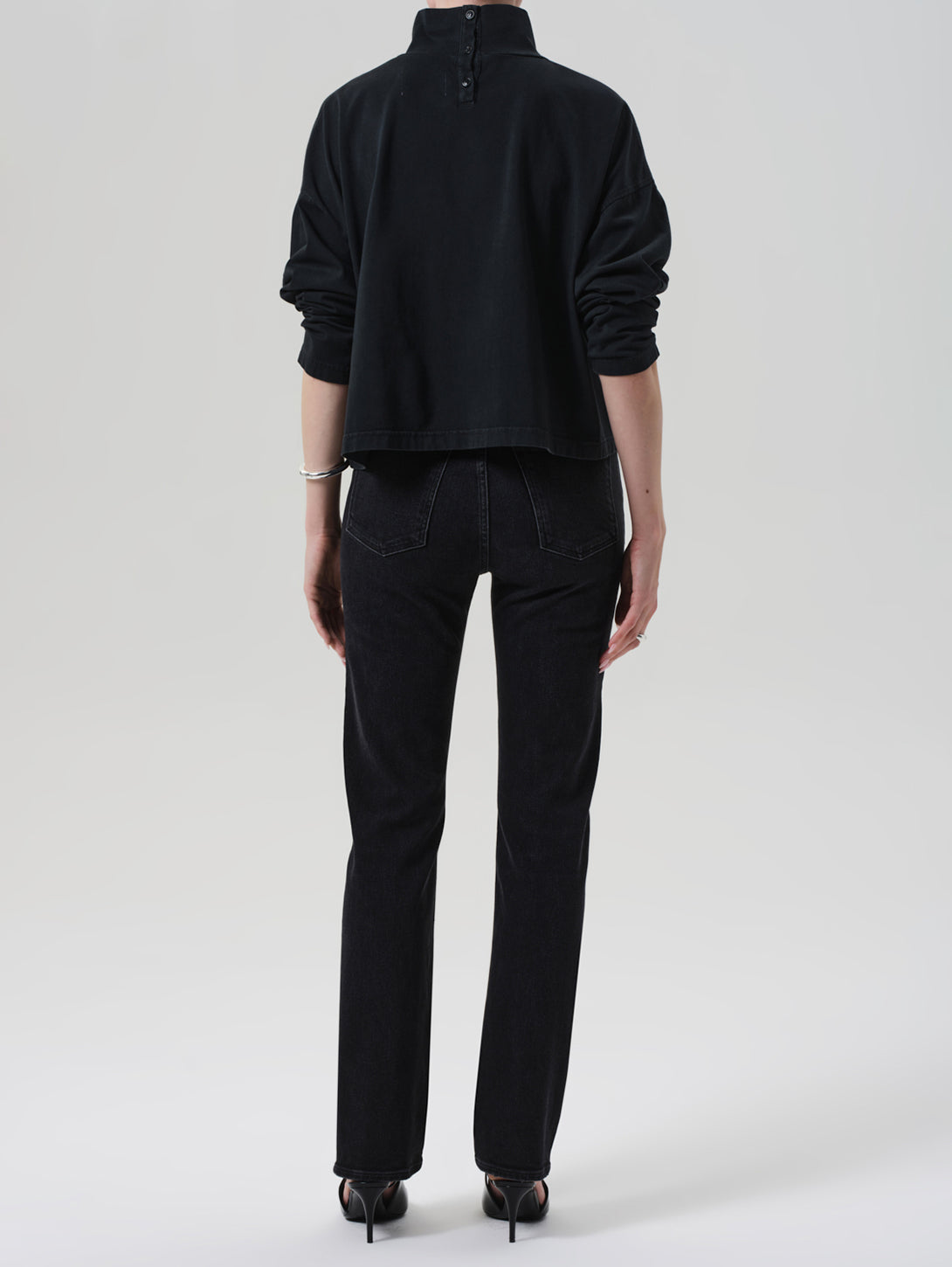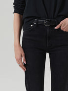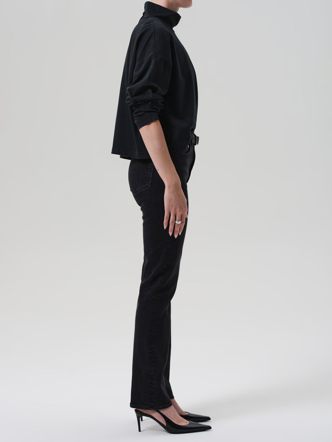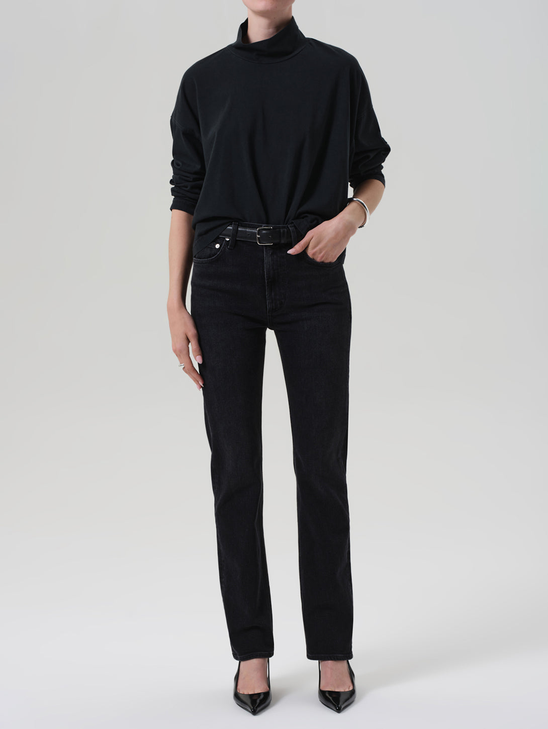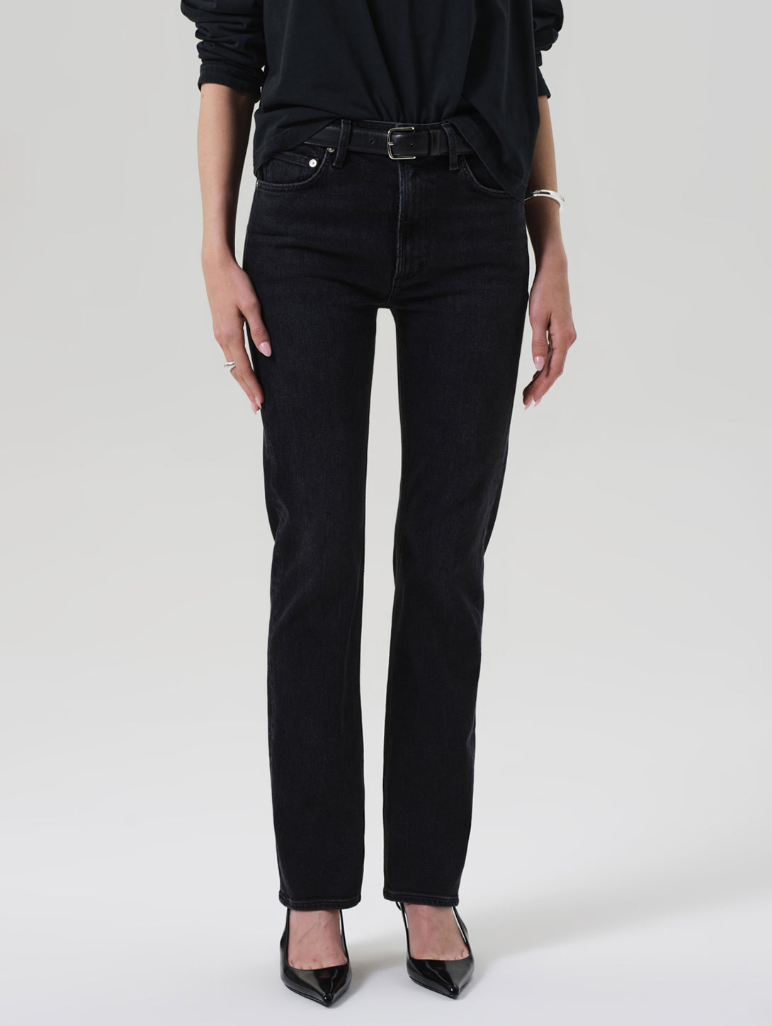 The ‘Zurie’ offers a polished straight leg with a soft, broken-in feel. Crafted from comfort stretch denim made with regenerative cotton, the silhouette sits high on the waist and falls clean through the leg. A rich, washed black finish adds modern edge—perfect with everything from boxy knits to sharp outerwear.
