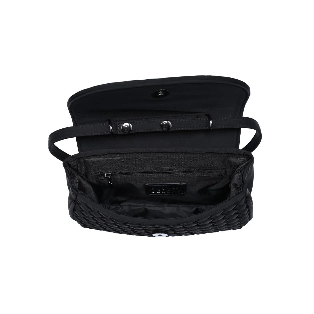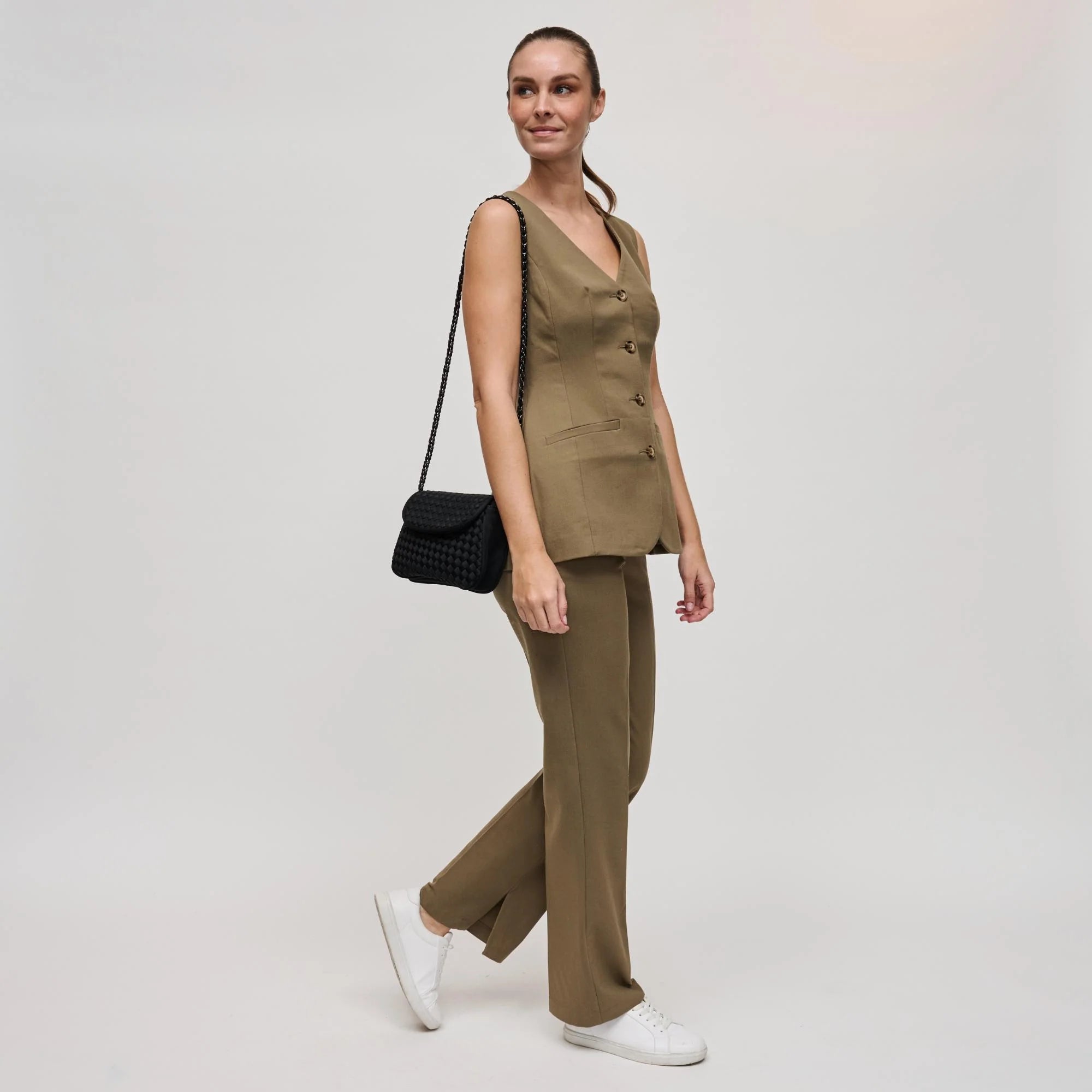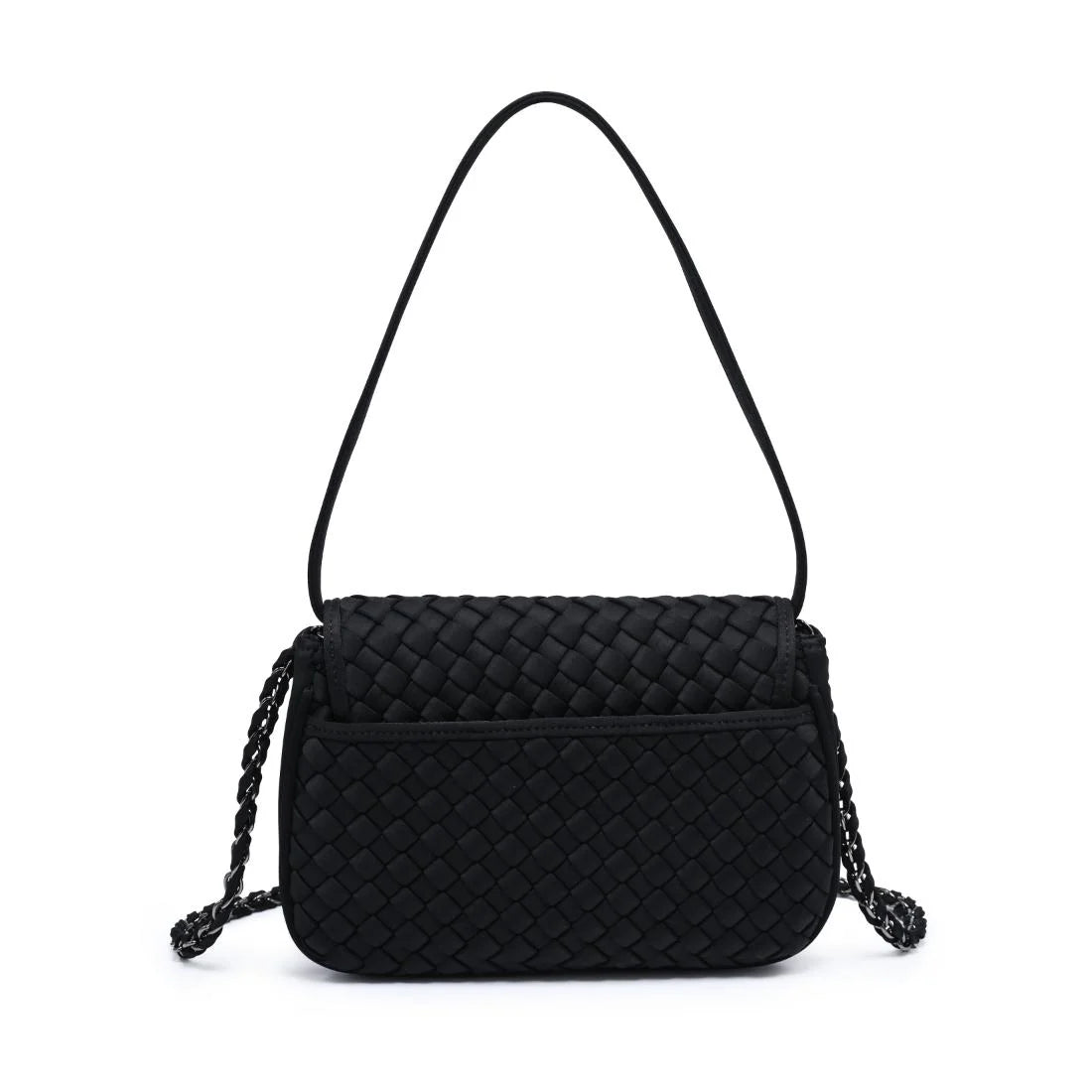 - Exterior Details: woven exterior adds texture; rear slip pocket offers quick access to cards or small items; two carry options: flat shoulder strap and braided chain.