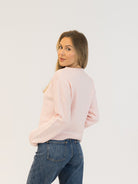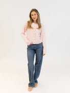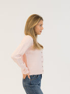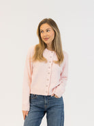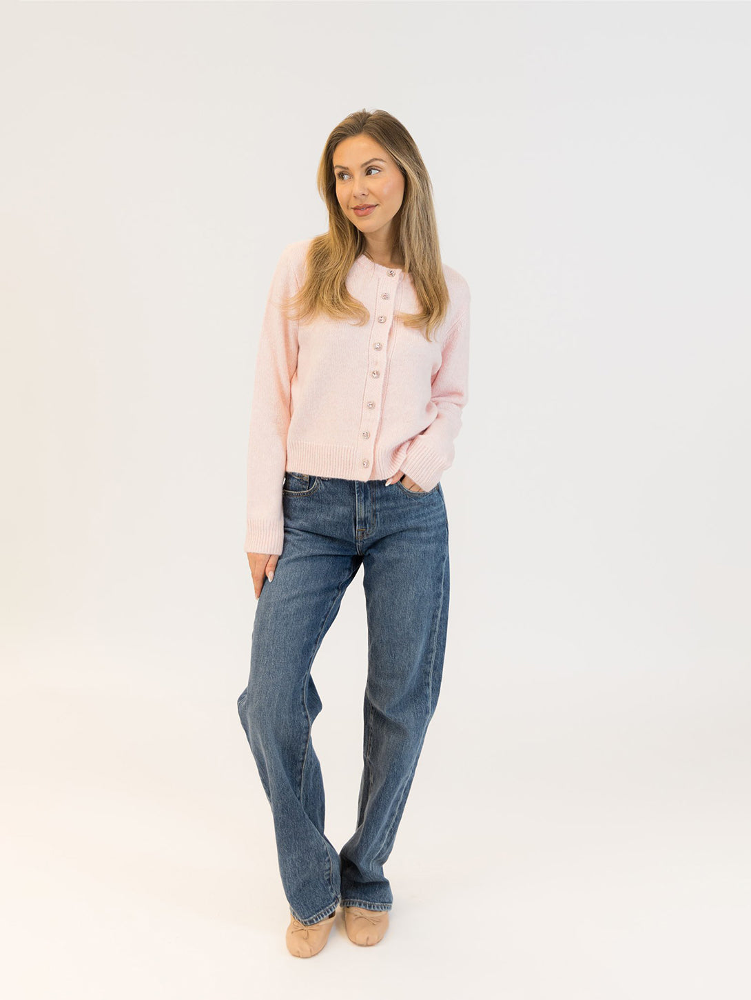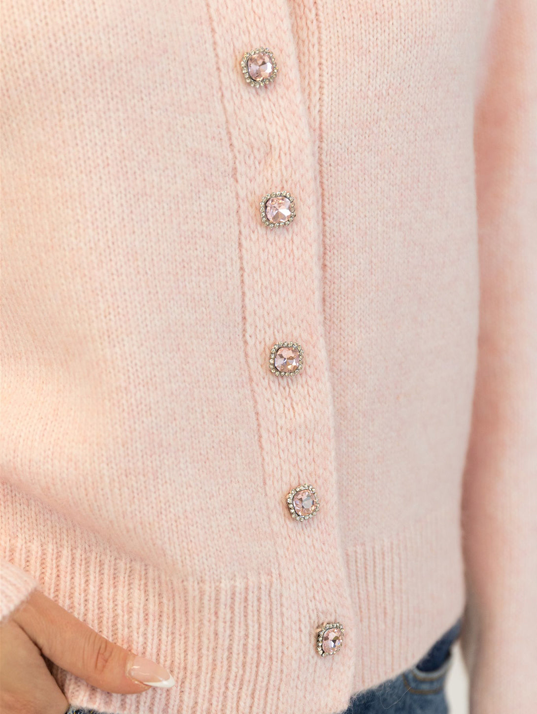 Elevate your wardrobe with this soft, pastel pink cardigan featuring delicate crystal buttons for a touch of sparkle. The crew neckline, ribbed trims, and slightly cropped fit make it a versatile piece for layering or wearing solo. Perfect for adding understated elegance to any look.