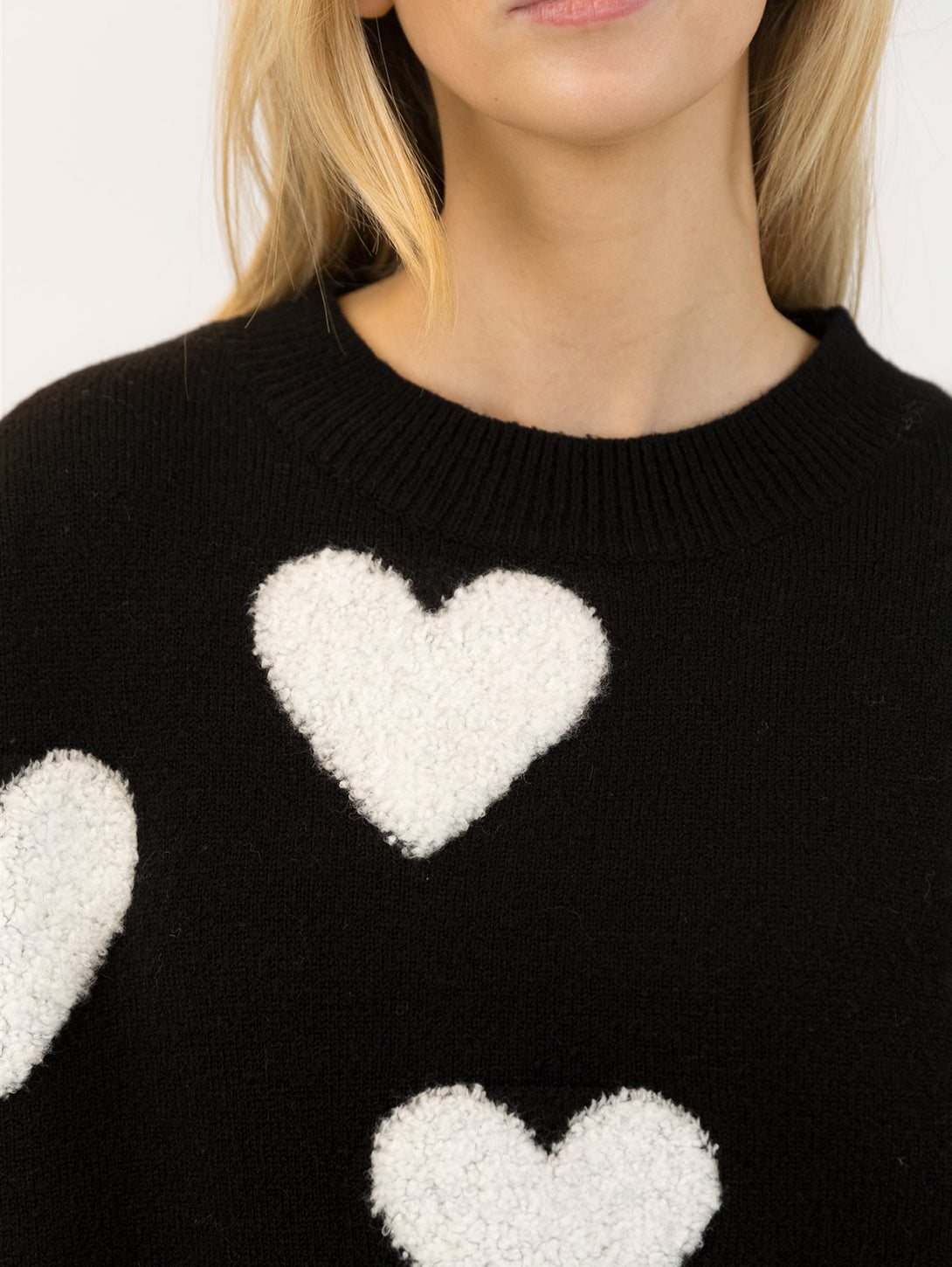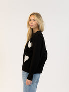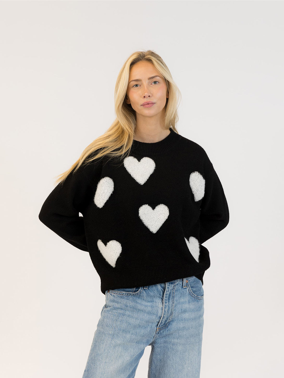 Adorned with white sherpa hearts, the Ajax sweater adds a playful and cozy touch to your look. The soft, warm fabric provides comfort, while the sherpa hearts add an eye-catching element, making it perfect for adding a bit of fun to your everyday style.