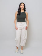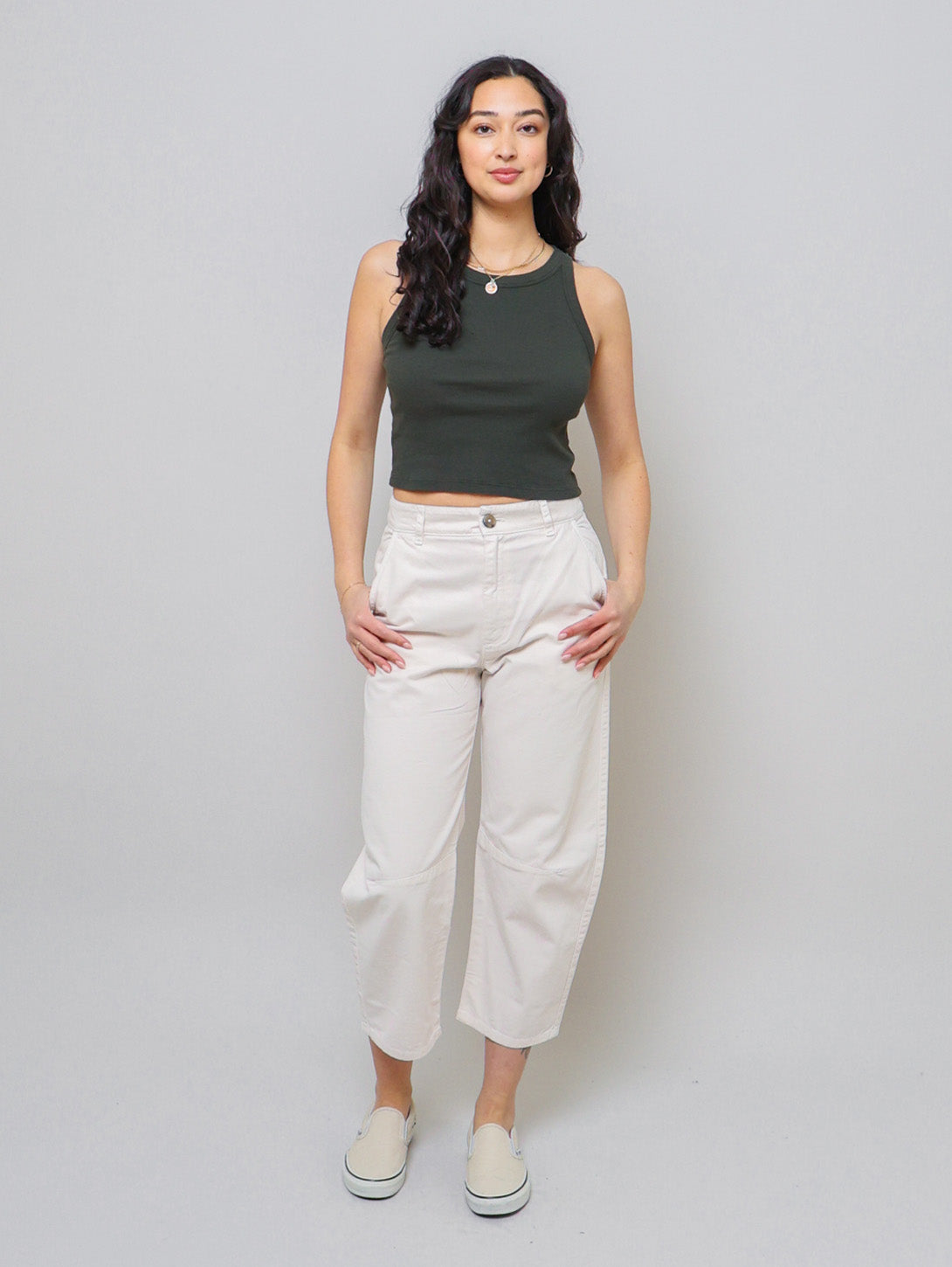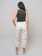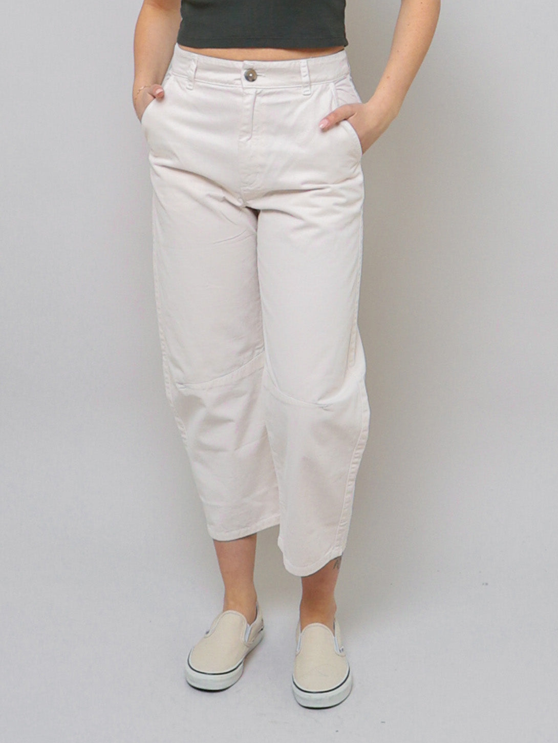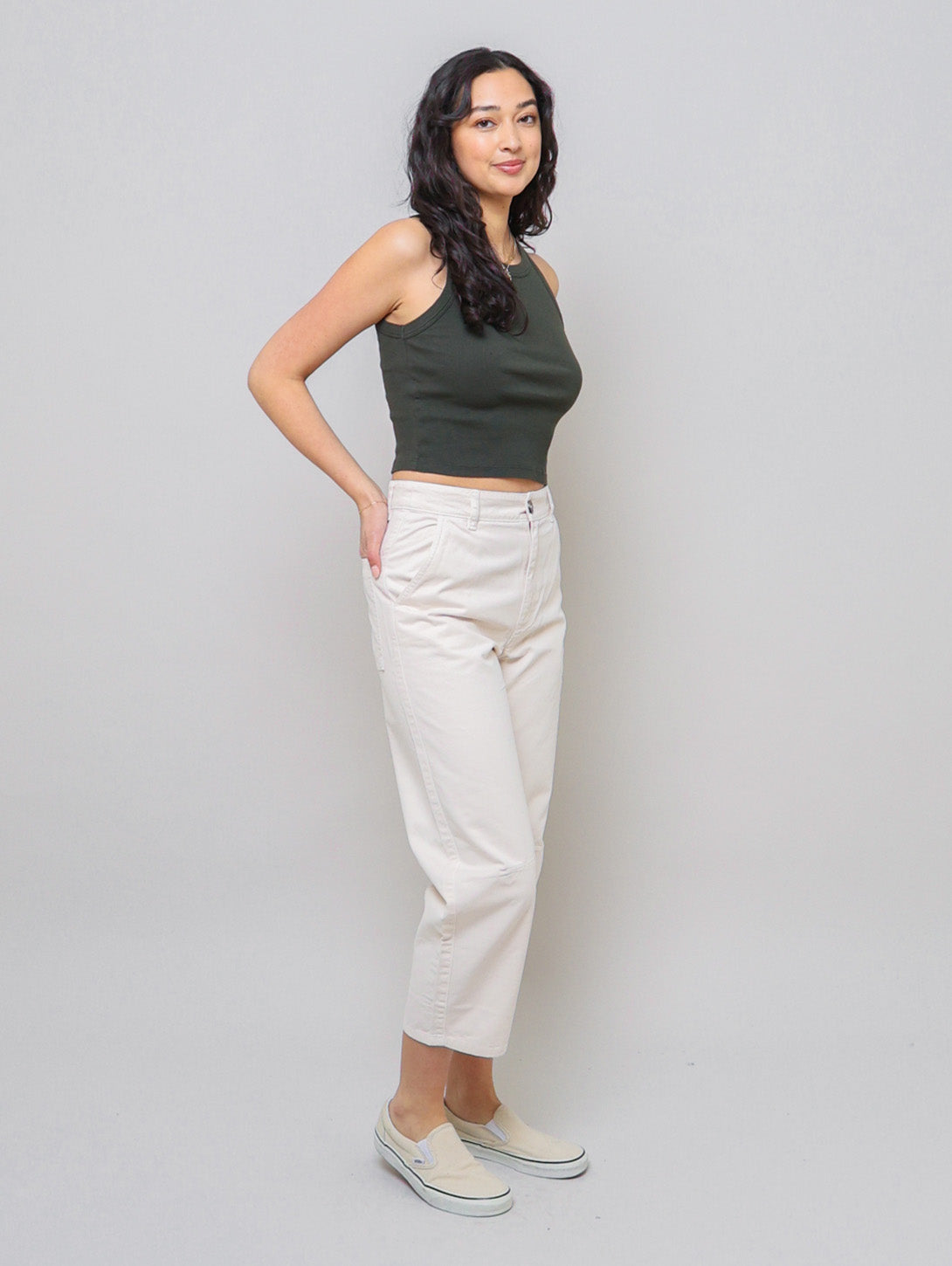 Crafted from cotton twill, these pants feature knee darting for a curved leg silhouette, a button and zipper closure, belt loops, slash pockets, and rear patch pockets. Cropped at the ankle for a versatile finish.
