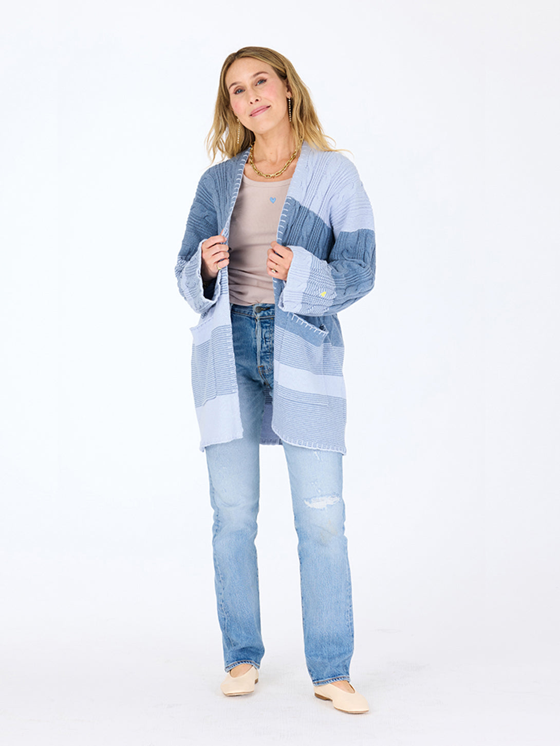 The Blankie Cotton Cardigan is back! Knit to perfection in a cool cotton blended yarn, in shades of blues, resembling your favorite washed out denim jeans. This cardigan is the perfect mid-weight sweater to take you from summer nights to fall days. Pair over our tee or tank for the perfect KR look!