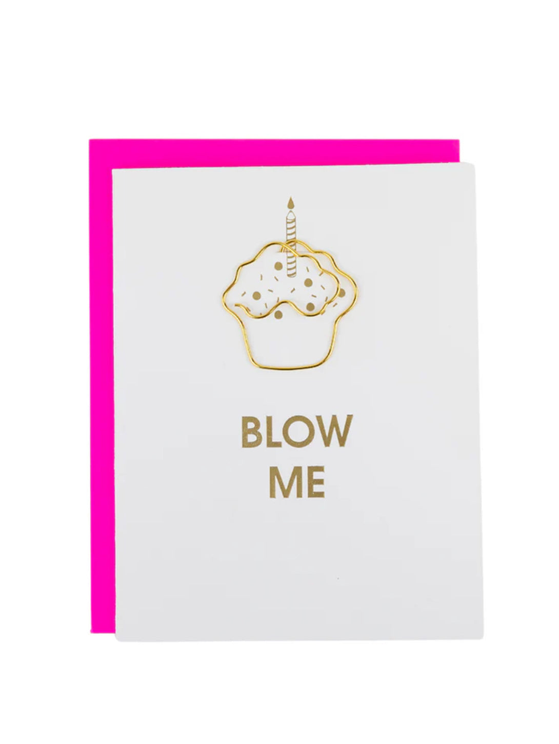 Our "Blow Me" card is letterpress printed on a vintage printing press in sunny California. Card includes a heavy duty cupcake paper clip.