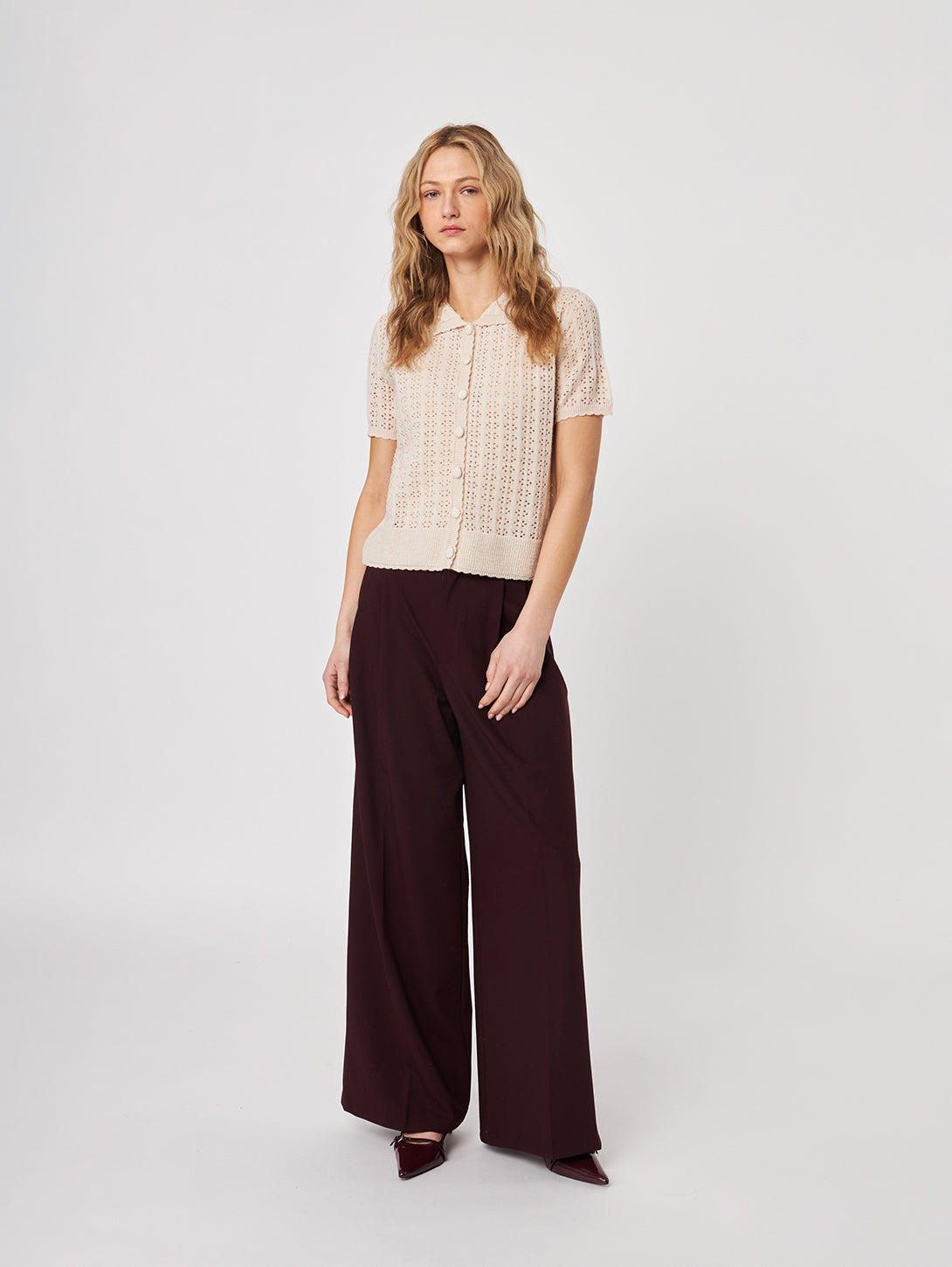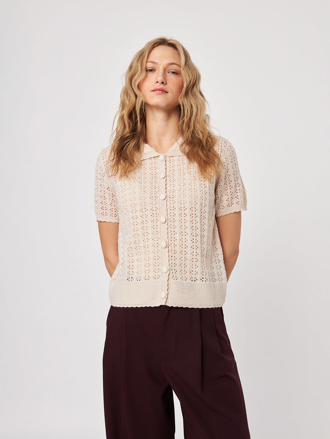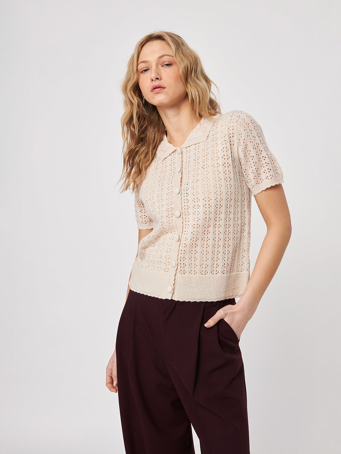 Delicate and feminine, this short-sleeve pointelle knit top is a soft, vintage-inspired essential. Designed in a warm beige hue, it features intricate pointelle stitching, a crew neckline, and front button closure. Its fitted silhouette makes it ideal for layering or wearing tucked into high-waisted bottoms.