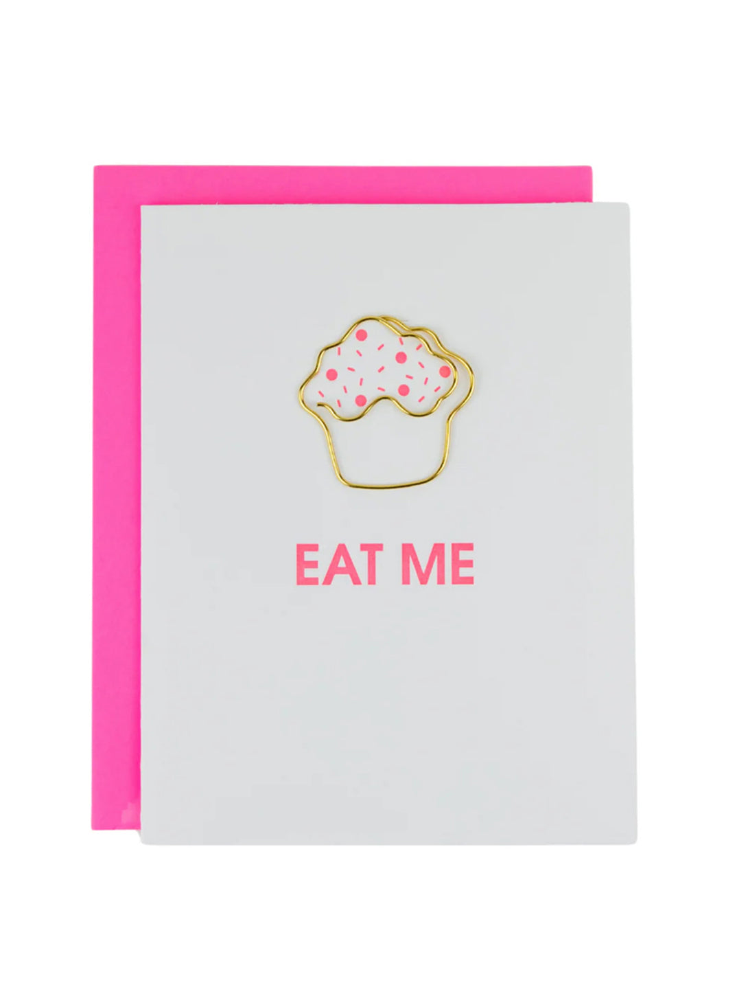 Our "Eat Me" card is letterpress printed on a vintage printing press in sunny California. Card includes a heavy duty cupcake paper clip.