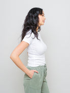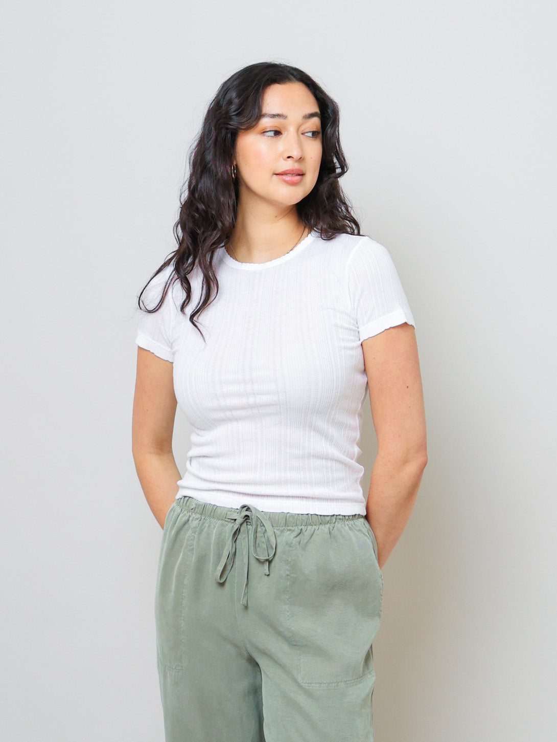 Delicate and feminine, this slim-fitting tee features fine pointelle detailing throughout. Ideal for layering or wearing tucked into high-rise denim for a soft, romantic look.