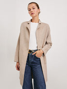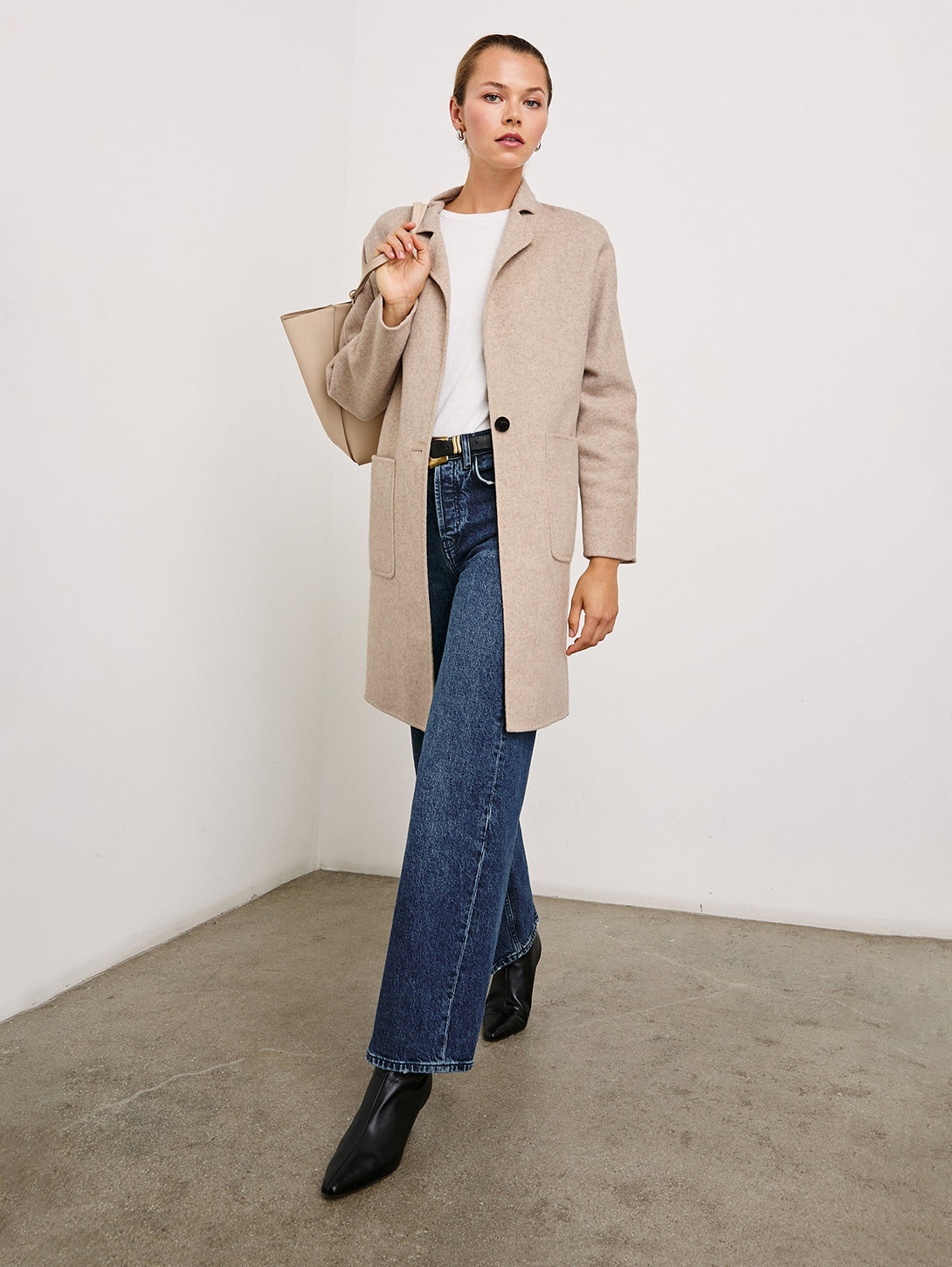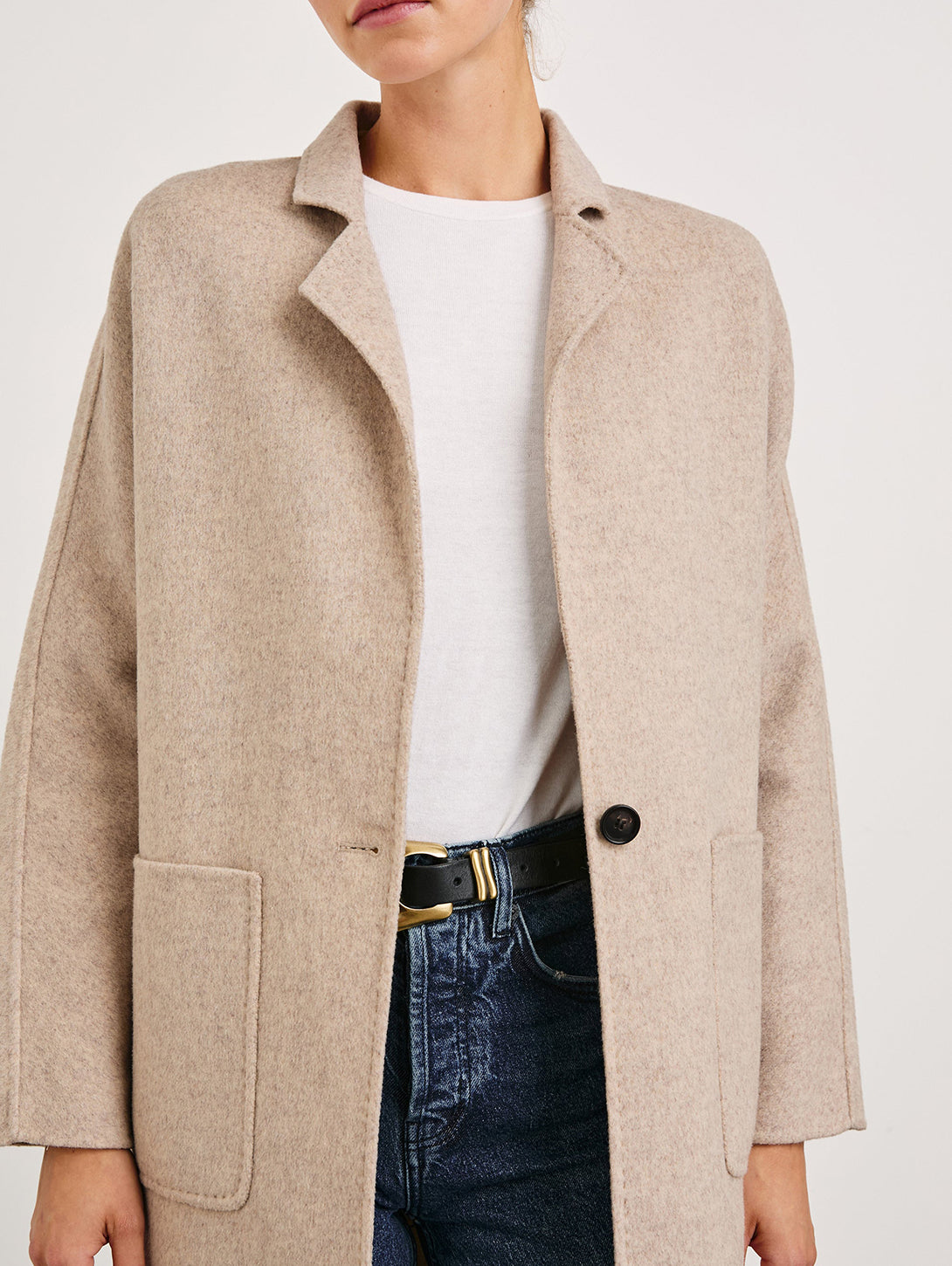 This luxe coat is the perfect third piece sure to elevate any outfit. Made from a heavyweight wool blend, this unlined coat features a slightly oversized fit, notched lapels, dolman sleeves, oversized patch pockets at hip, and a single-button front closure with horn button.