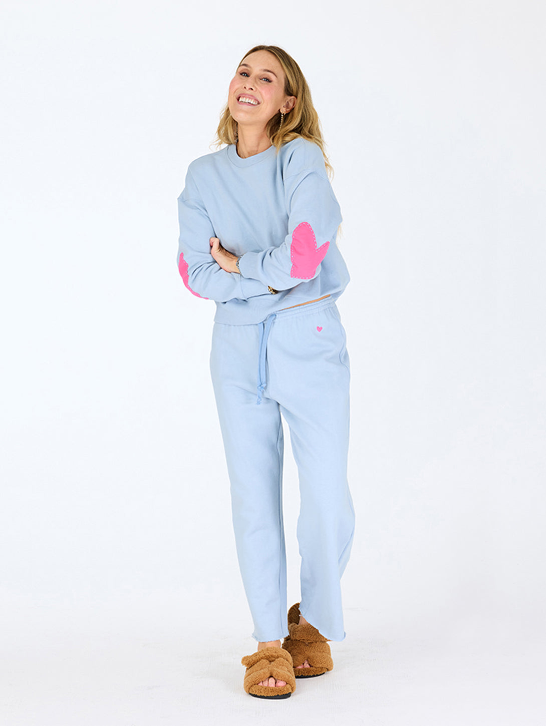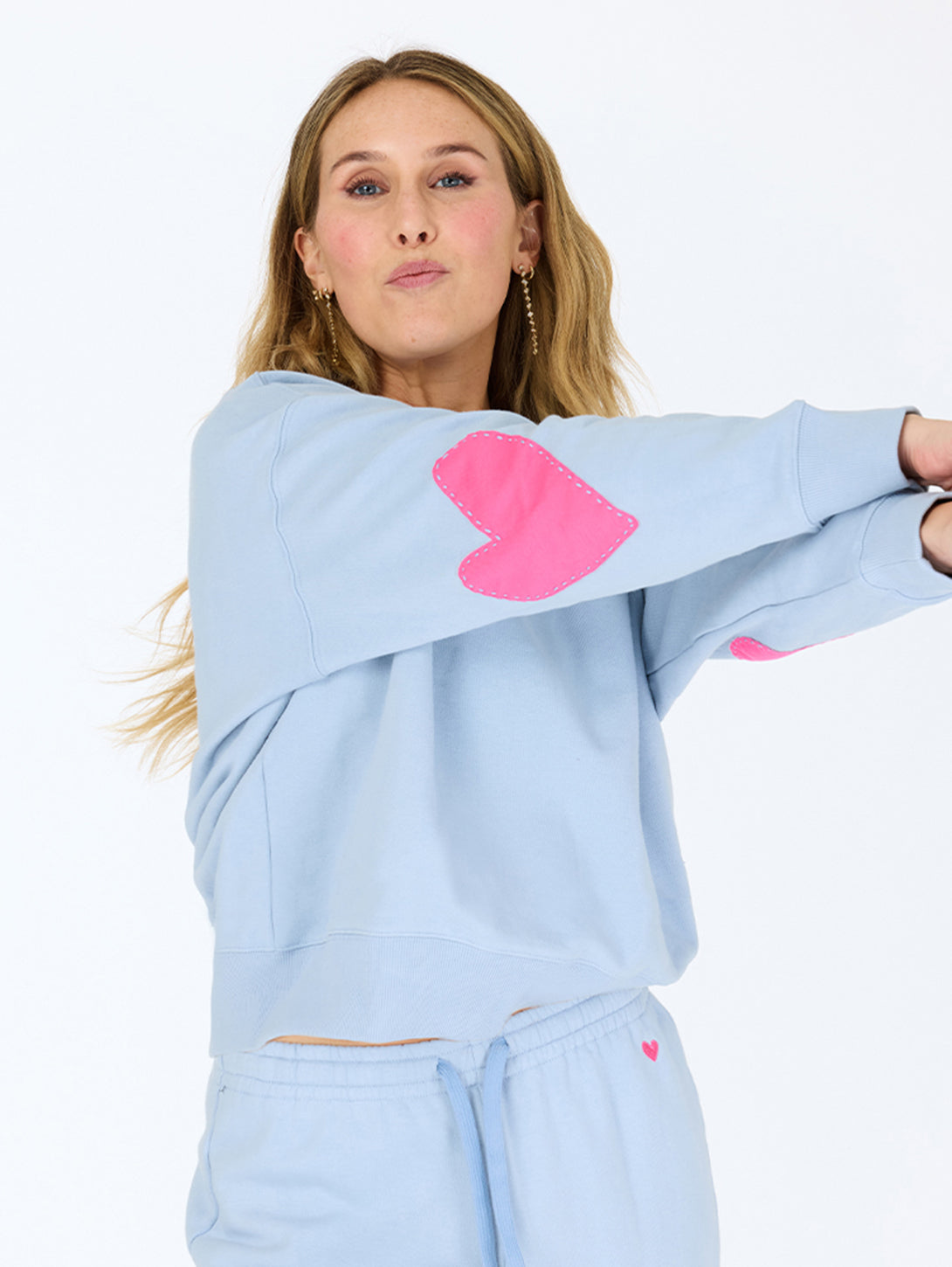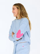 Our Ex-Boyfriend Patchwork Sweatshirt -a classic KR piece- is back this time in slate blue with hot pink contrast Imperfect Heart elbow patches.