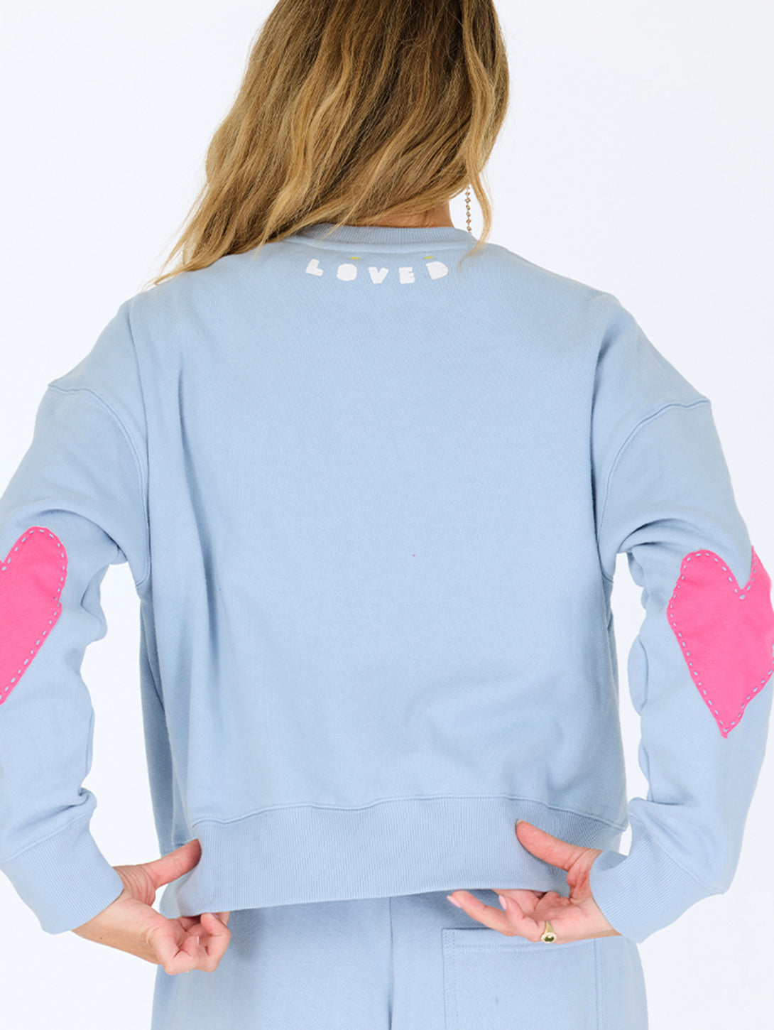 - 'Loved' graphic at back neck in contrast color with contrast heart elbow patches