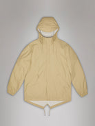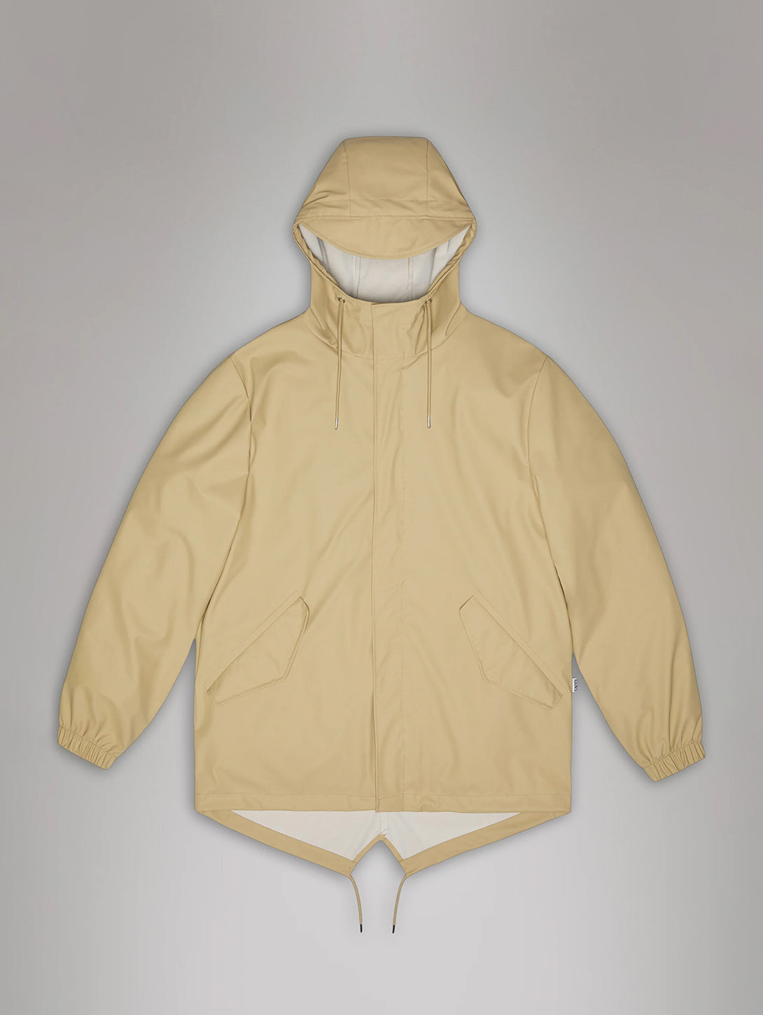 Fishtail Jacket is a unisex raincoat. Characterized by its pared-back aesthetic and drawstring fishtail hem.