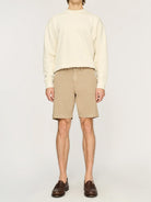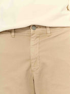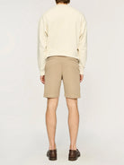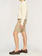 Jake is a refined chino short with clean-lined detailing and a comfortable, slim straight thigh. Soft Beige is a light khaki hue. It features matte silver hardware, tonal stitching, a clean hem and a black back patch.