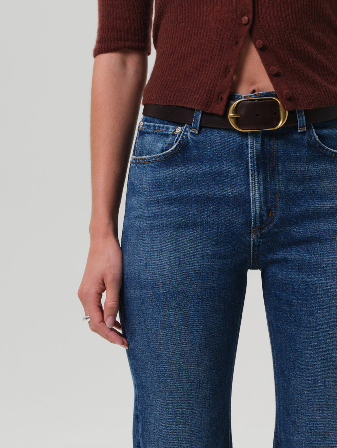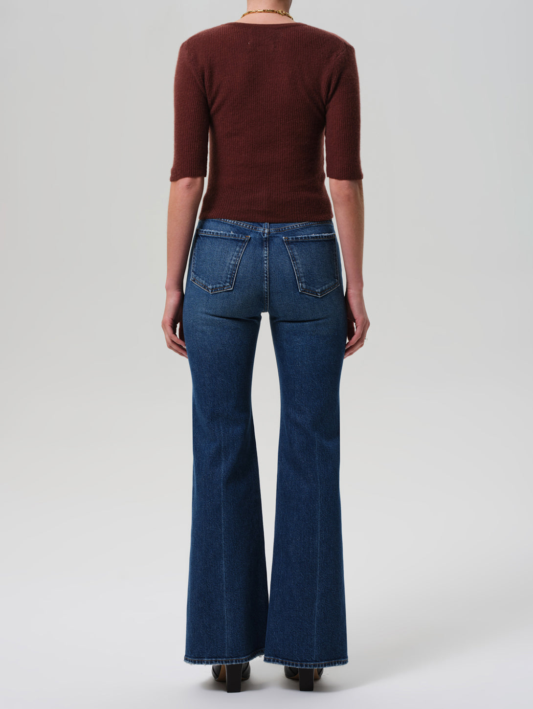 The Kimberly is a high-rise flare inspired by classic '70s silhouettes, designed to elongate the leg and contour the waist. Crafted from comfort stretch denim with a super soft hand, it offers lasting shape and all-day ease. The Cruise wash—a medium-to-dark indigo with soft fading and marbling—adds vintage character. Style with slim knits or structured shirting for a clean finish.