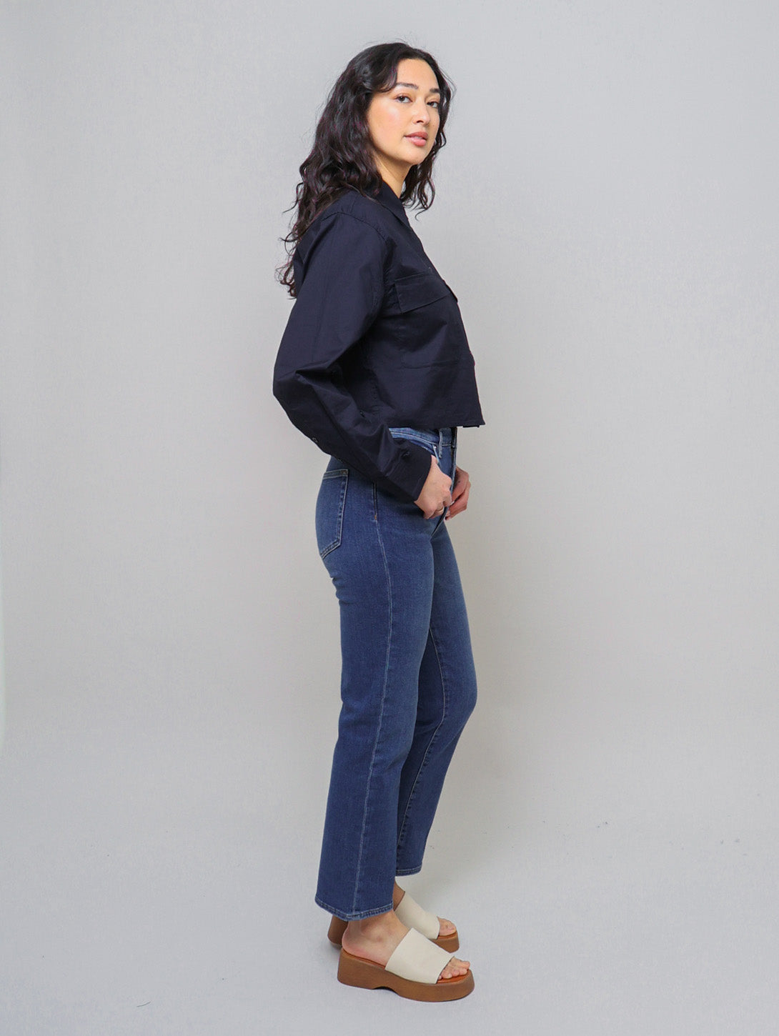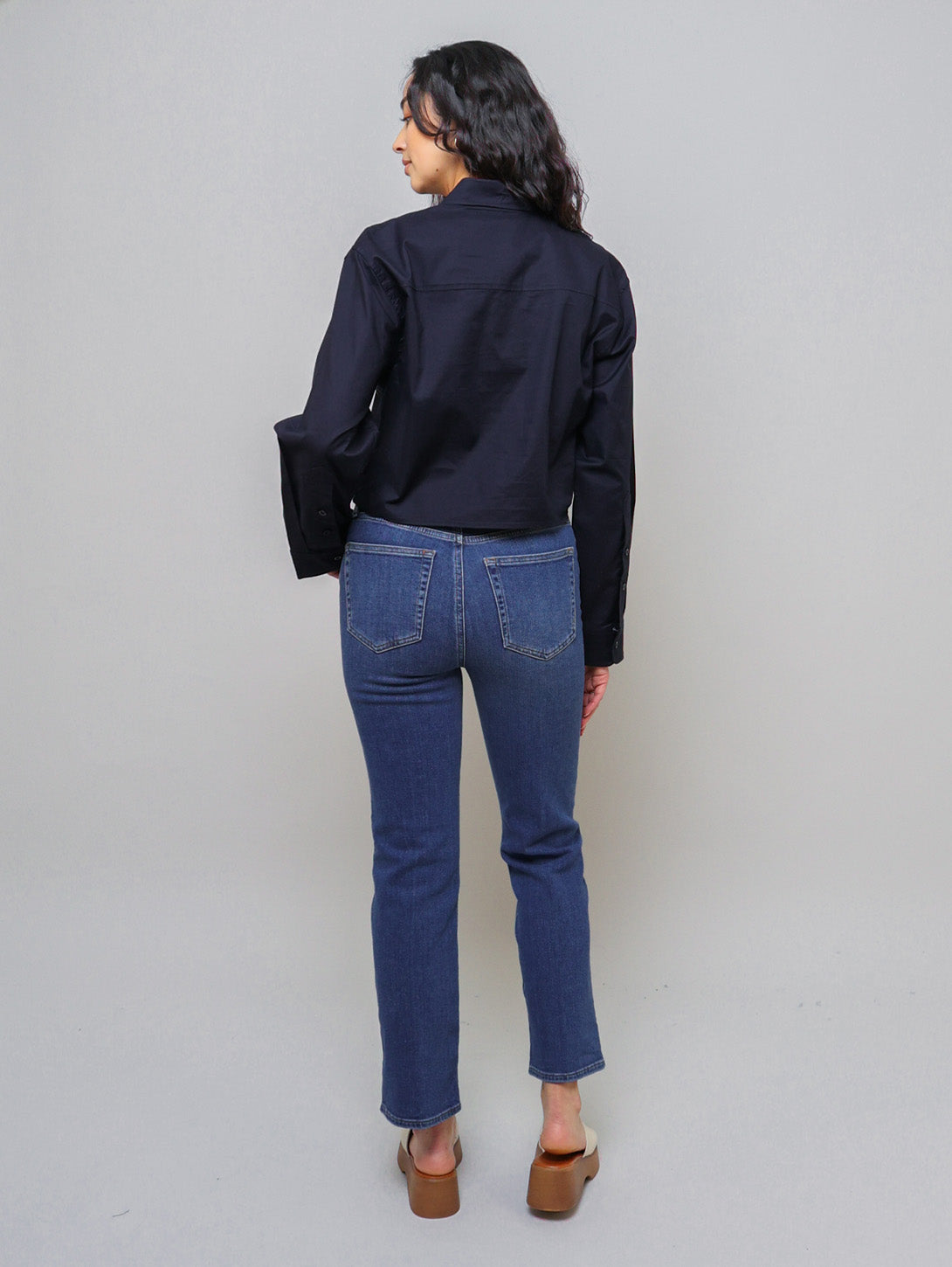 A FRAME introduction to the new eased out straight silhouette designed with a comfortable high rise waist, fitted hip, and subtle wide-leg flare. Crafted from a stretch cotton modal blend for the softest wear. Feel free to wear with flat shoes as per the modern ankle length.