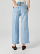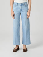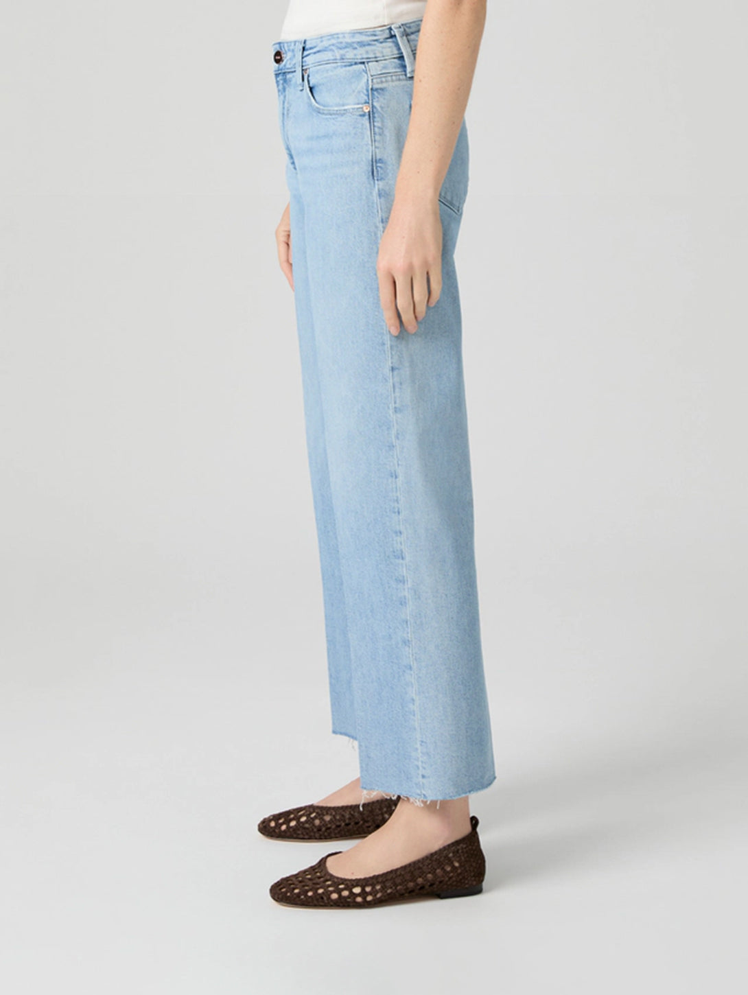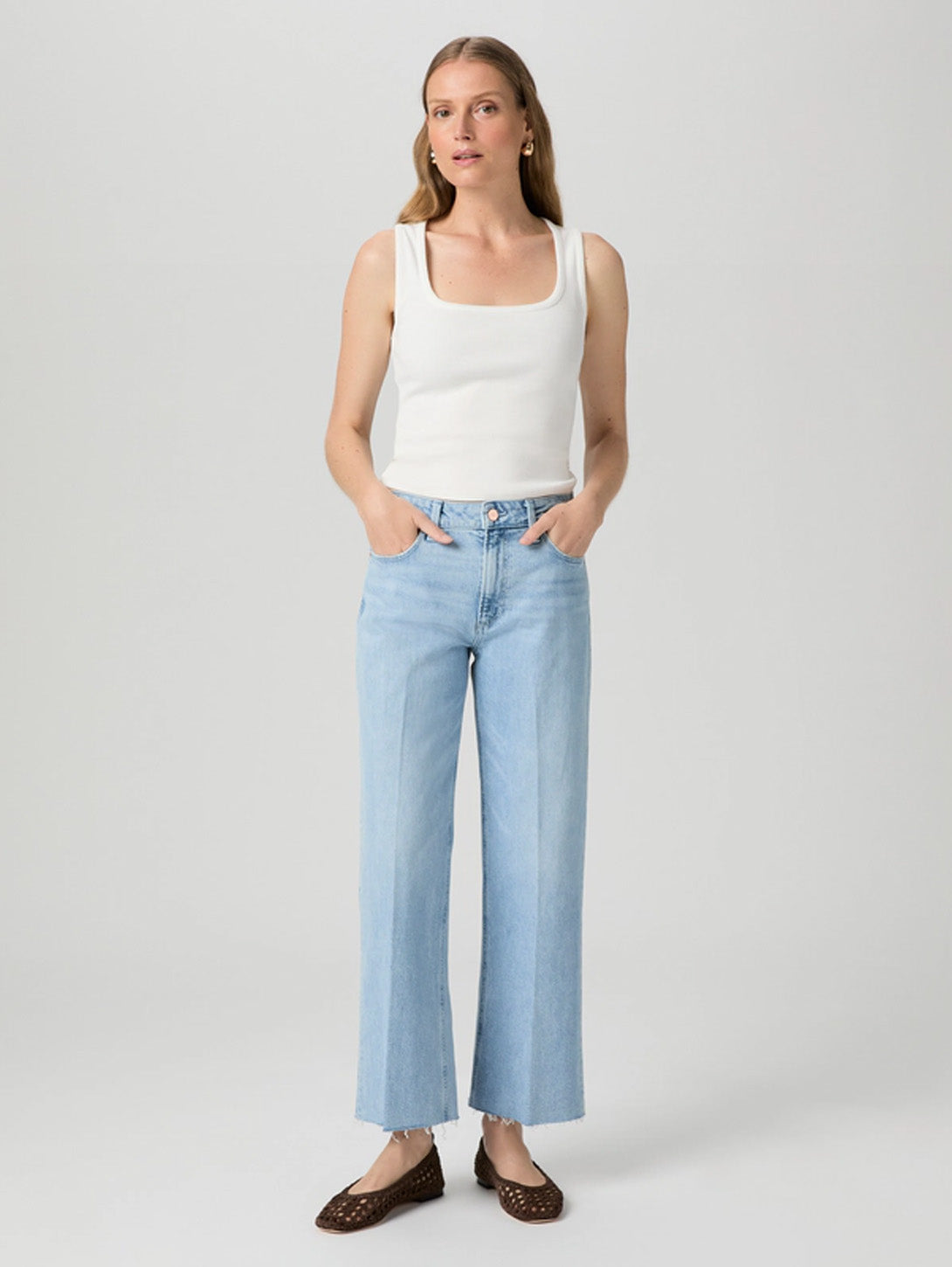 This sleek wide leg is designed with a high-rise, a flattering bow leg and an easy ankle length inseam that can be paired with any shoe heel height. This pair is crafted in PAIGE VINTAGE denim with a portion of organic cotton in a clean light wash with a raw hem. PAIGE VINTAGE takes all the work out of breaking in your favorite pair of vintage jeans. We've combined the comfort of stretch with everything you love about authentic vintage denim to create super soft jeans that feel perfectly lived-in from the very first wear.