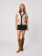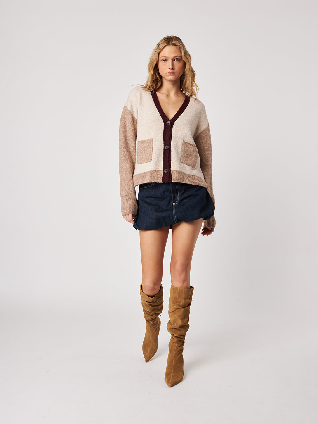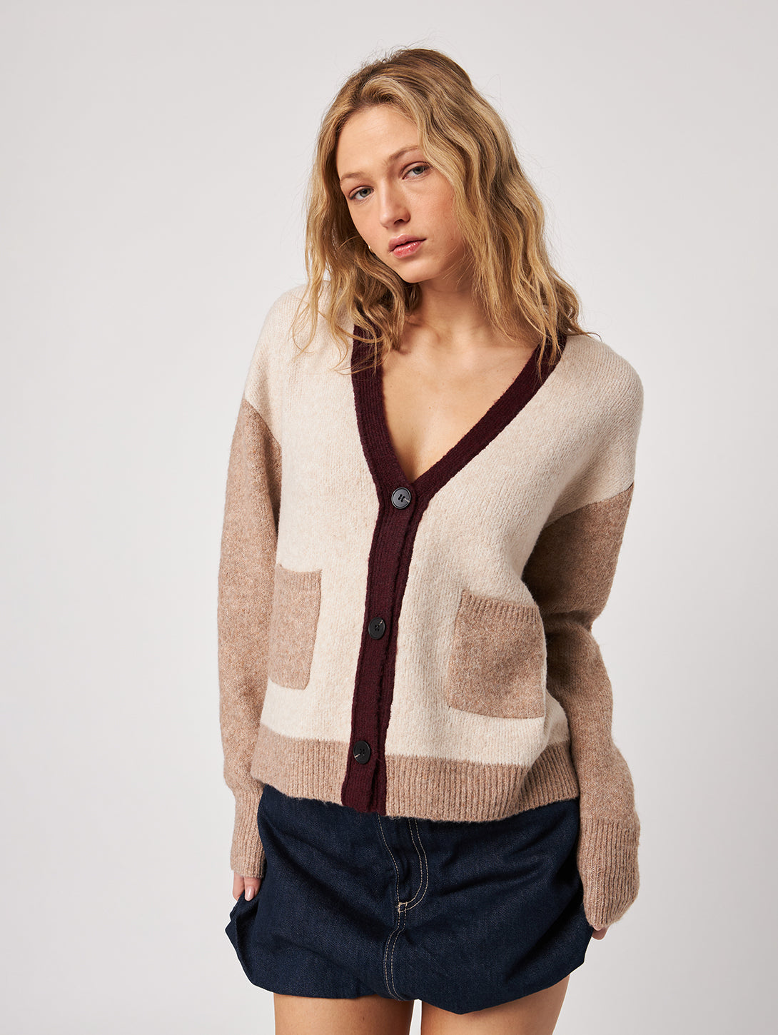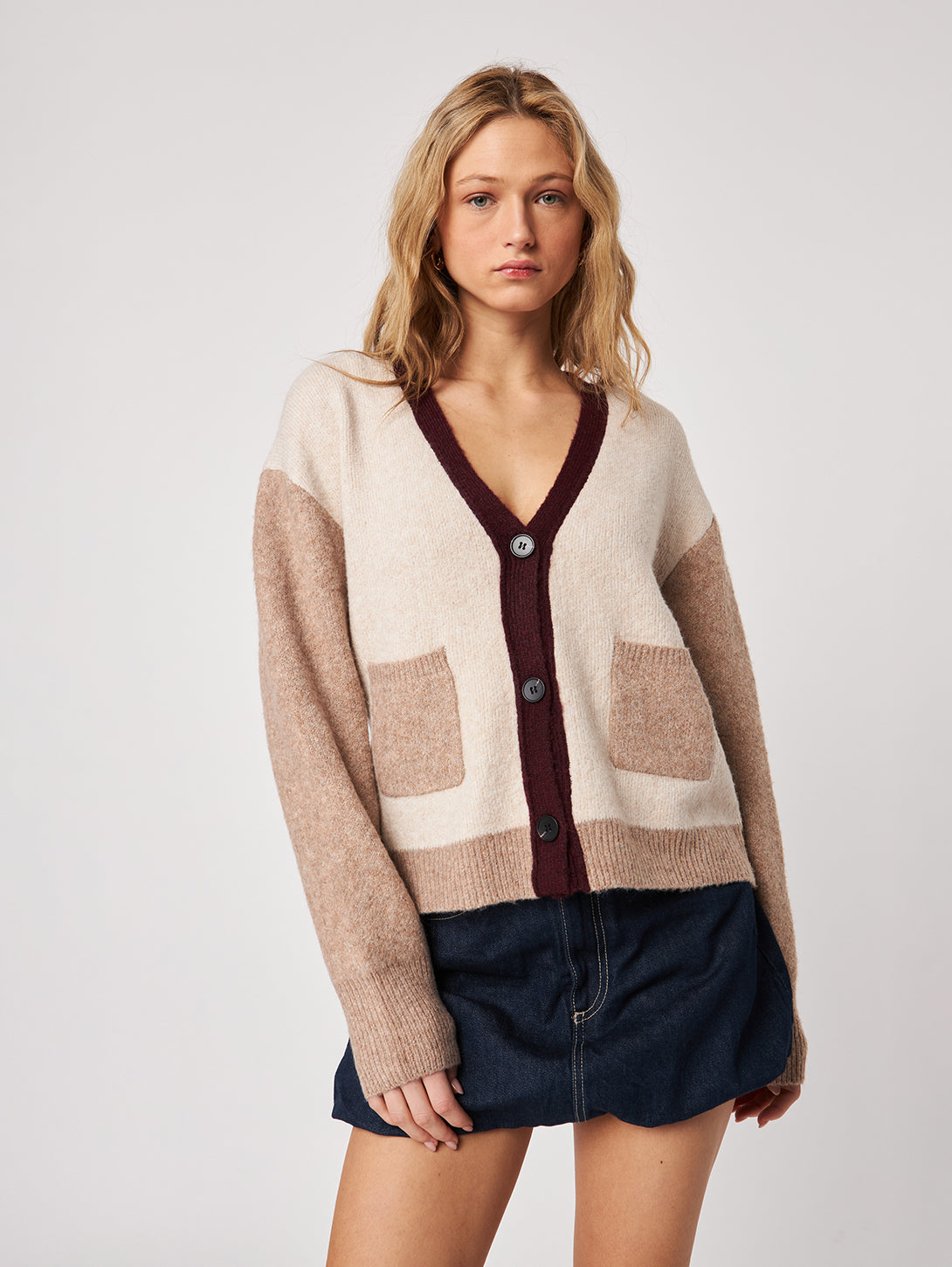 Effortlessly cozy with a modern twist, this colorblock knit cardigan is your go-to layering piece for transitional seasons. Featuring soft neutral tones in beige and taupe with a deep burgundy trim, it’s designed with a relaxed fit, dropped shoulders, and front patch pockets for a casual, cool vibe.