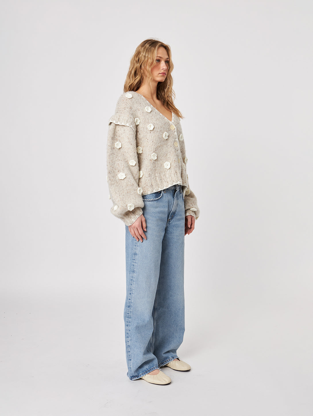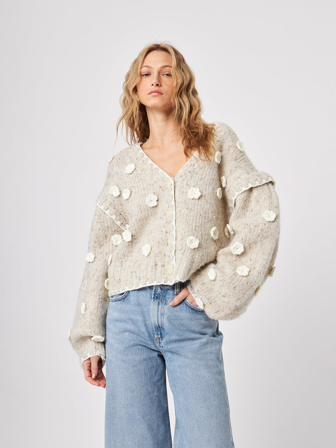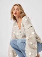 Effortlessly romantic, this lightweight button-up blouse features soft bubble-textured polka dots for added charm. Designed in a relaxed silhouette with a deep V-neckline and voluminous balloon sleeves, it brings a touch of femininity to any outfit. The natural beige tone makes it endlessly versatile—wear it tucked into denim or loose over a slip skirt for a breezy, laid-back look.