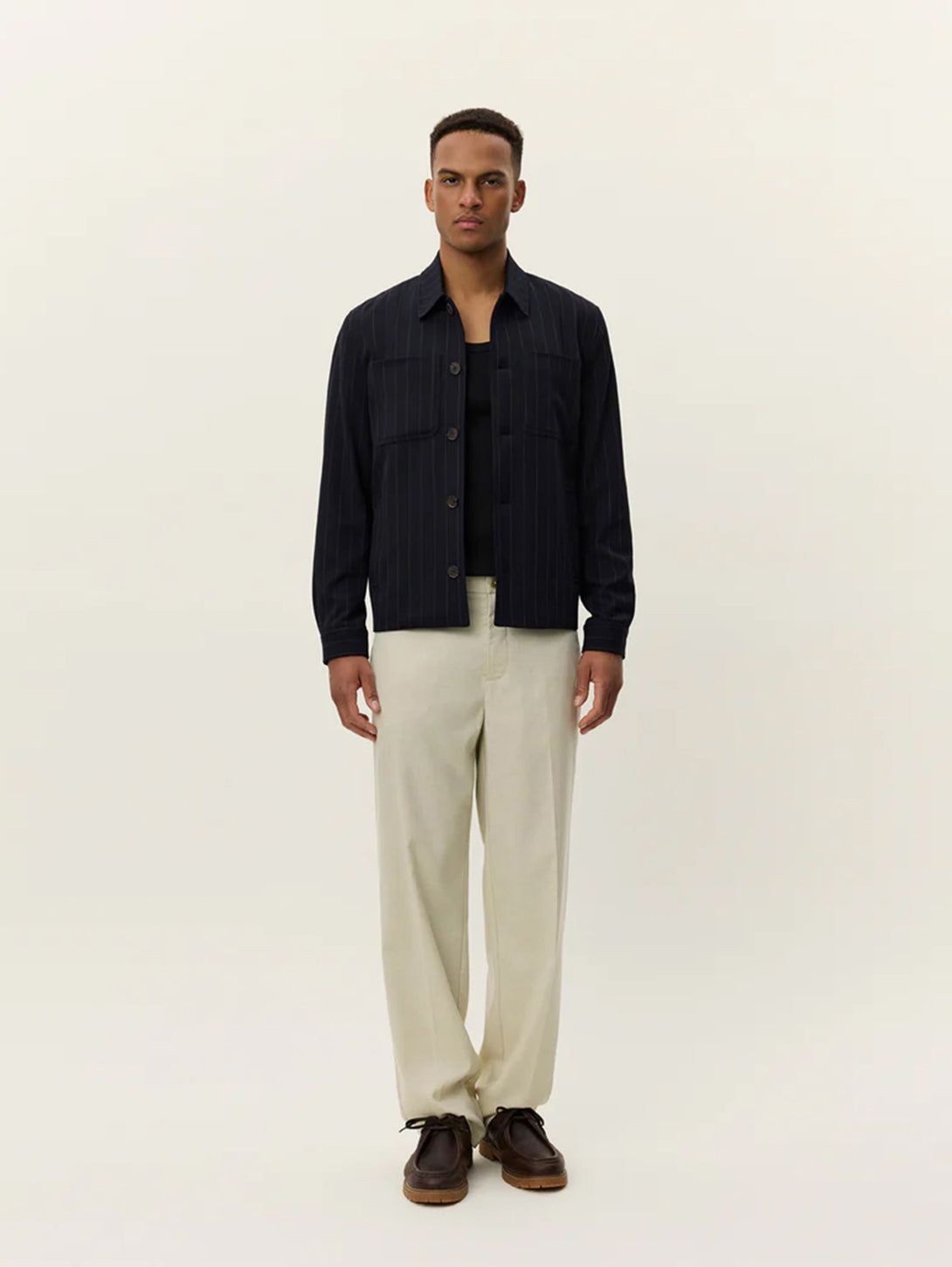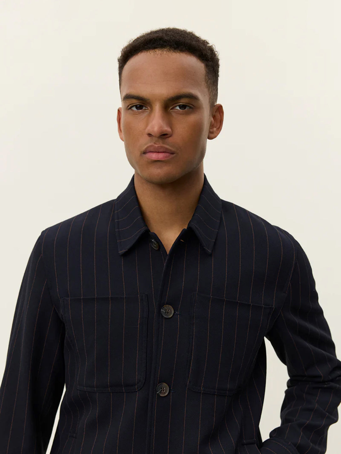 This edition of our signature Marseille Jacket comes in a light pinstripe pattern. It features chest pockets and button cuffs.
