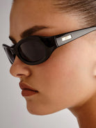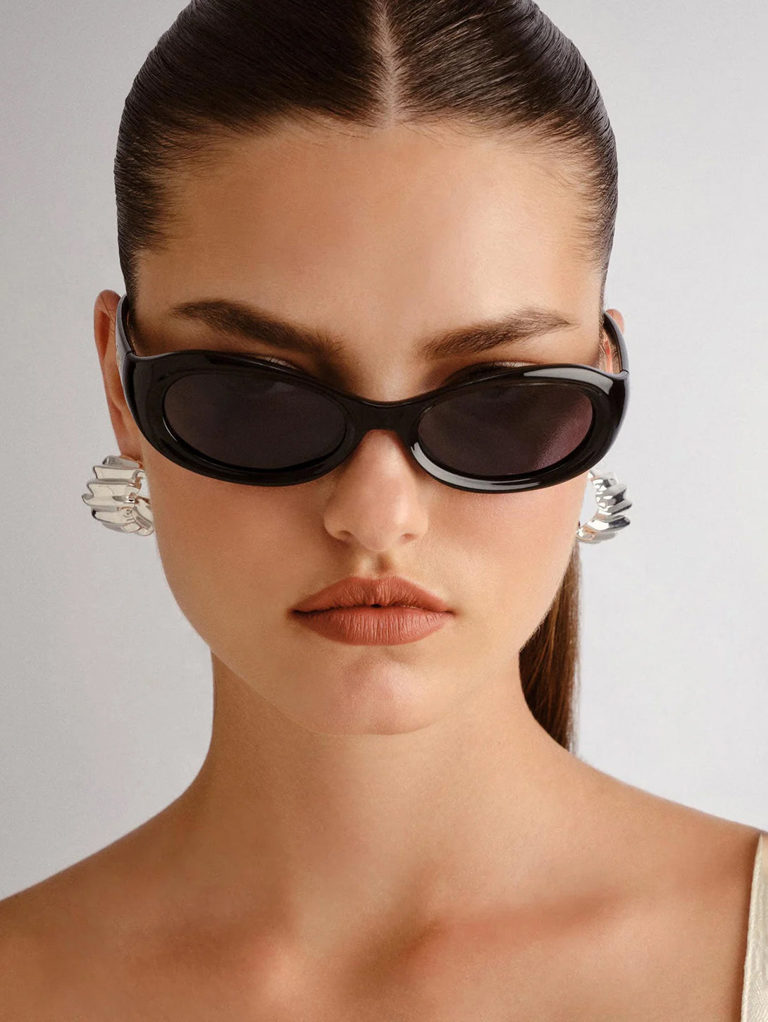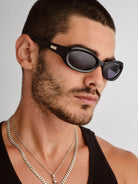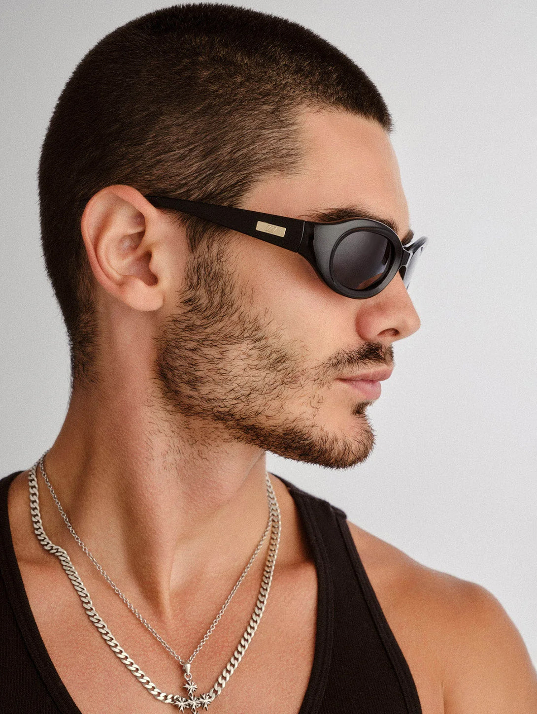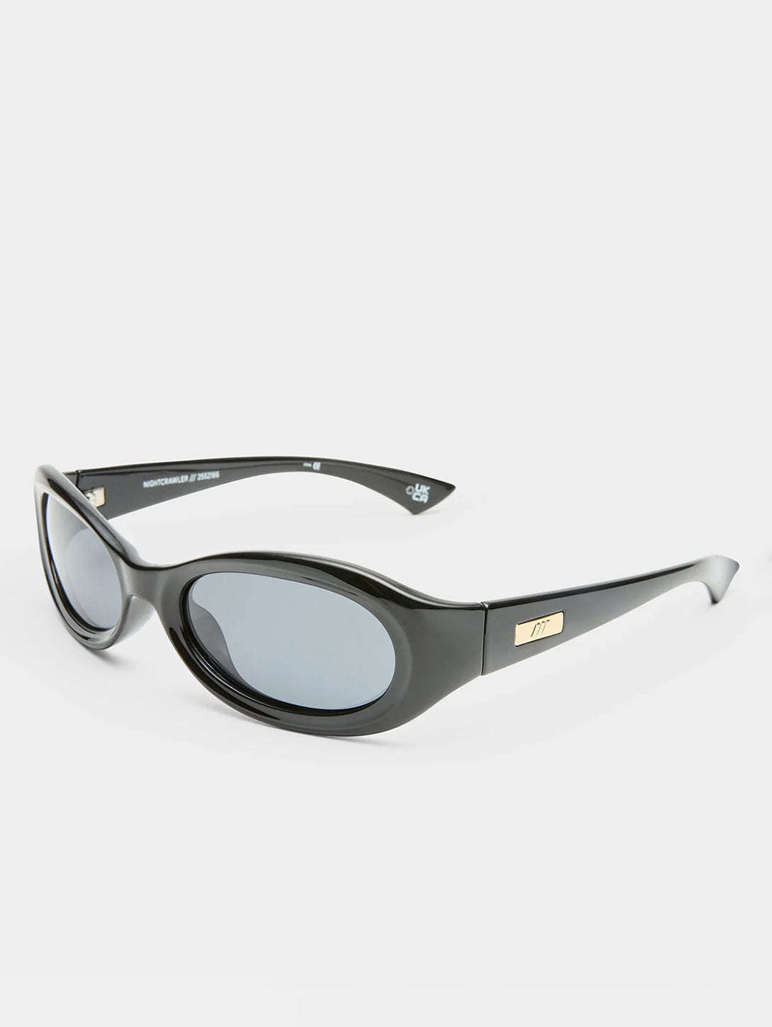 Drawing inspiration from millennial club culture, our NIGHTCRAWLER wraparound sunglasses redefine daring style. With sporty, sweeping proportions, this midsize unisex design hugs the face for a sleek, contoured fit; and is finished with high sheen rounded pill style flagstripe hardware on both temples.